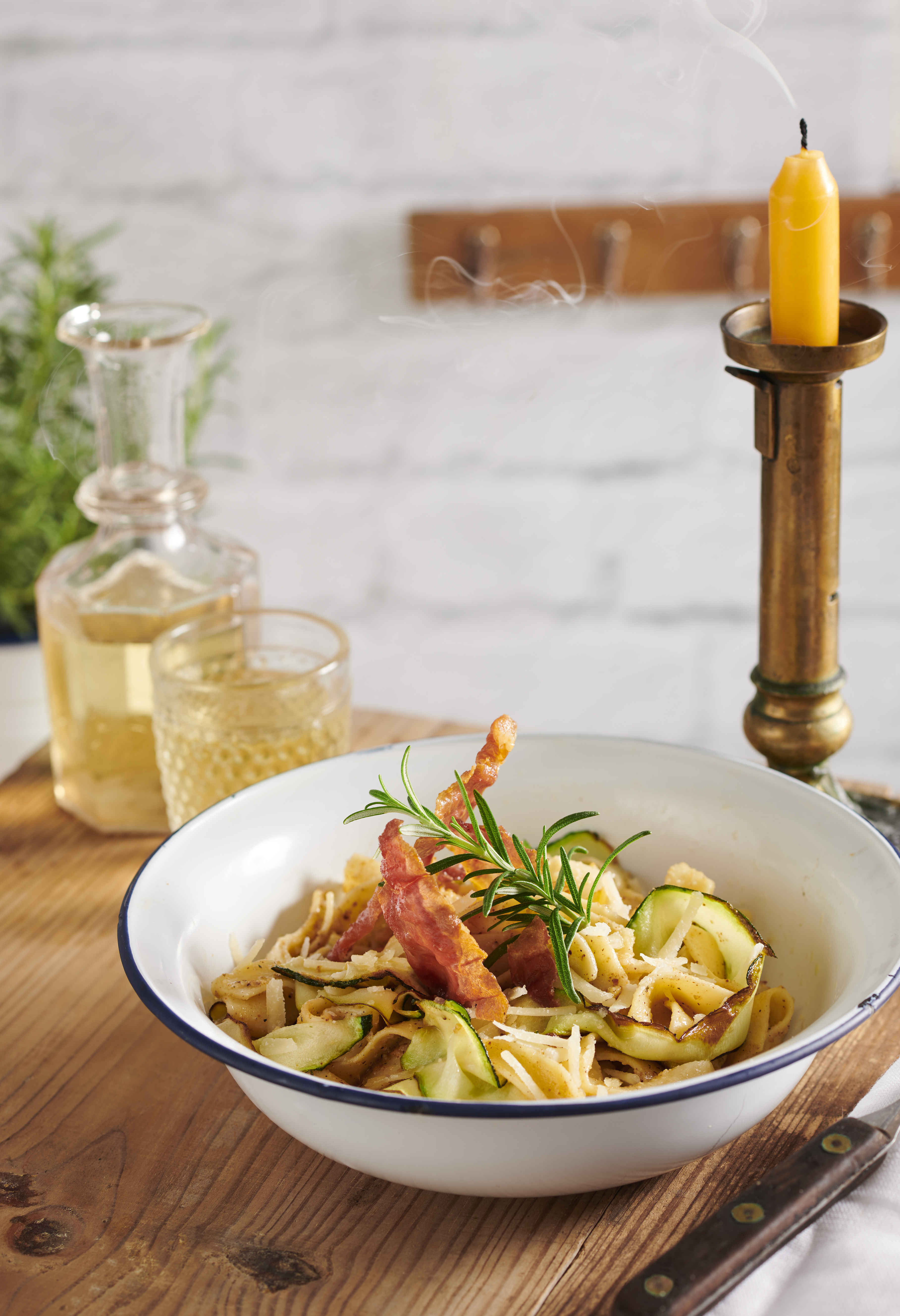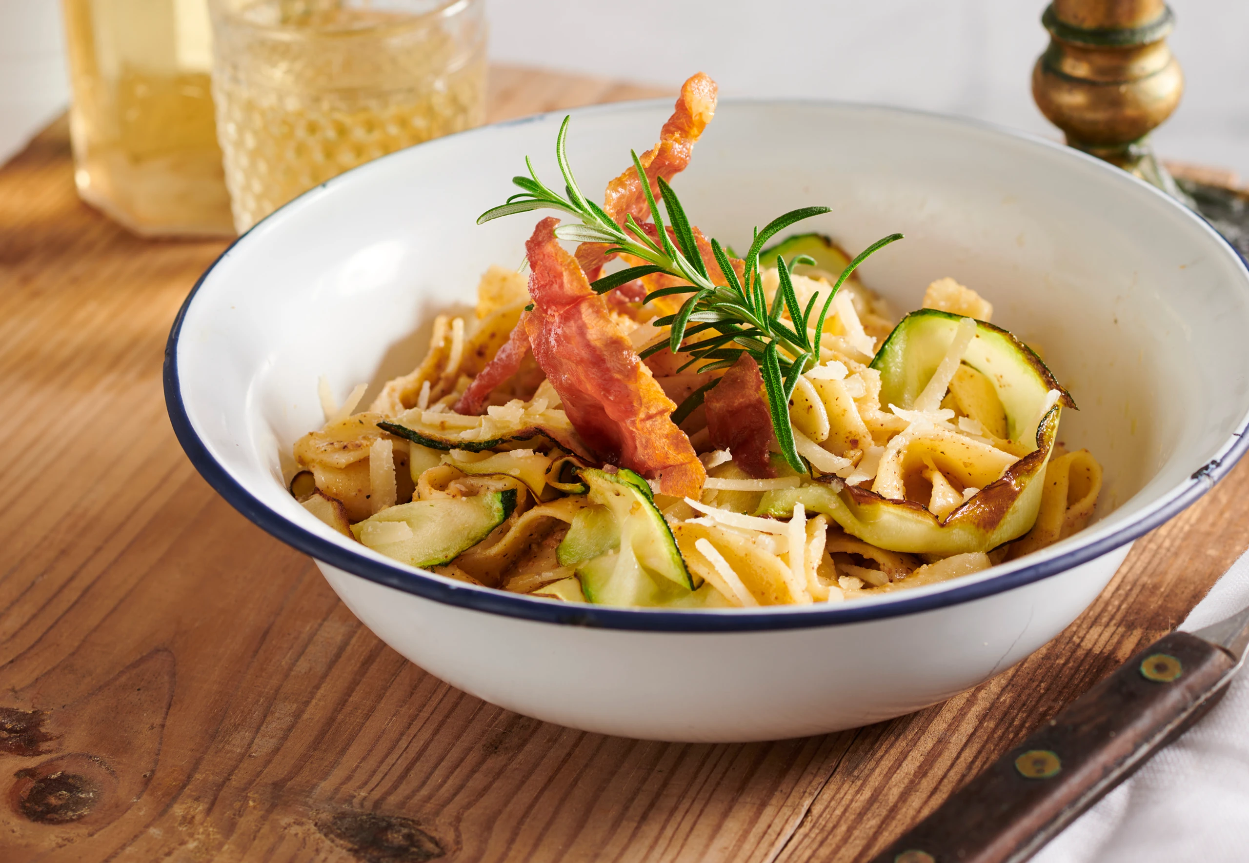 Pappardelle abseihen, abtropfen lassen und mit Zucchinistreifen und Pesto vermischen. Pappardelle mit dem knusprigen Schinken anrichten, mit Parmesan bestreuen und mit Rosmarin garnieren.