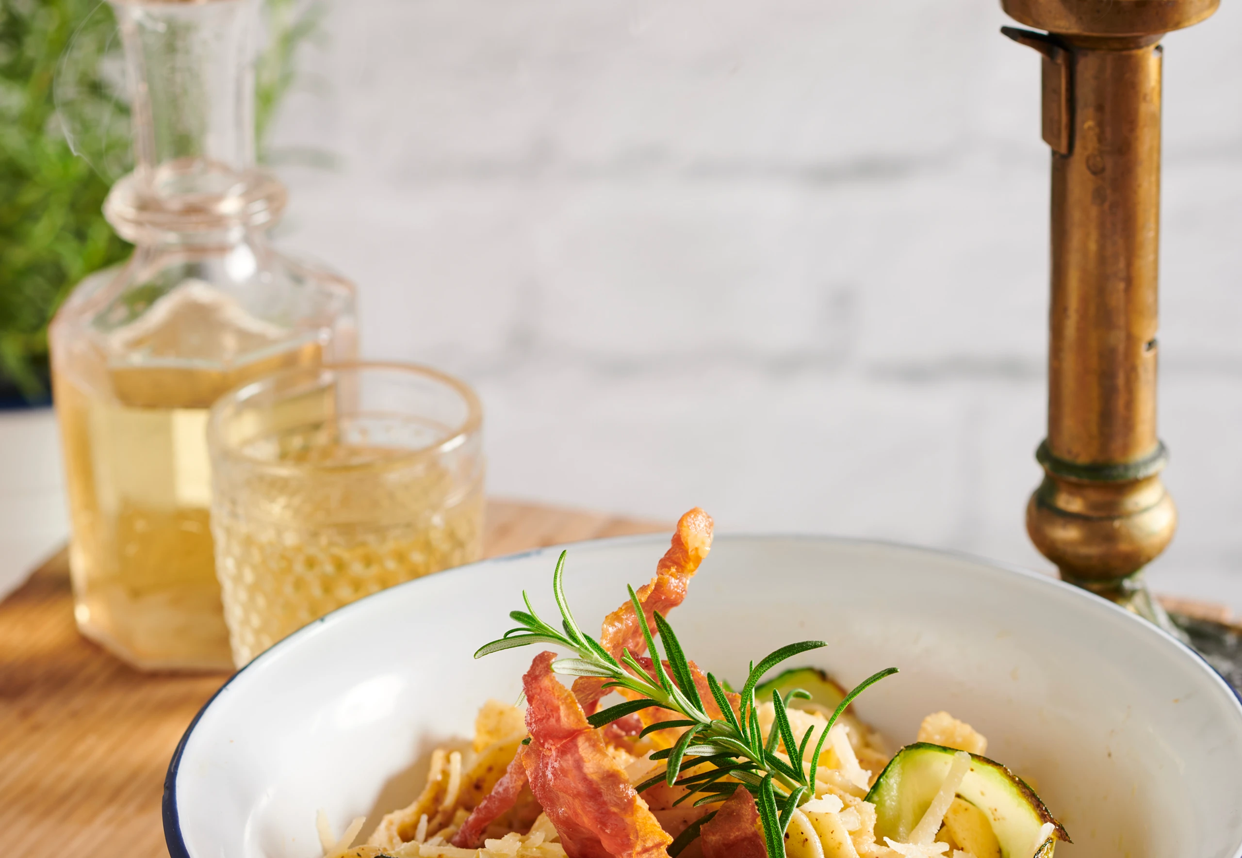 Pappardelle mit Nusspesto, Zucchini und knusprigem Schinken