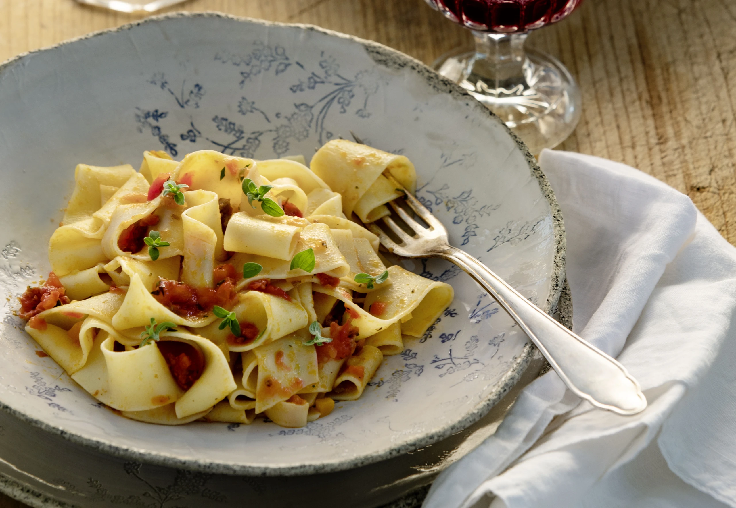 Pappardelle in reichlich Salzwasser bissfest kochen, abseihen, mit dem Sugo anrichten und mit Grana und übrigem Majoran bestreut servieren.