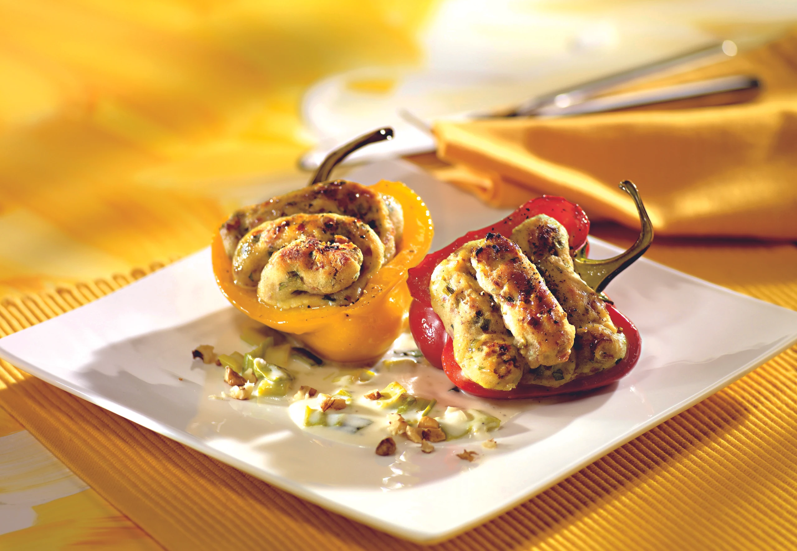 Rohr auf 180°C vorheizen. Eine Auflaufform mit Öl ausstreichen. Fülle mit einem Dressiersack in die Paprikahälften dressieren. Paprika in die Form setzen und im Rohr (mittlere Schiene / Gitterrost) 30 Minuten backen. Paprika mit der Lauchsauce anrichten. *Für ein Erdäpfelteig-Rezept folgen Sie bitte dem Link: https://www.gusto.at/rezepte/erdaepfelknoedel-apfelfuelle-butterbroesel