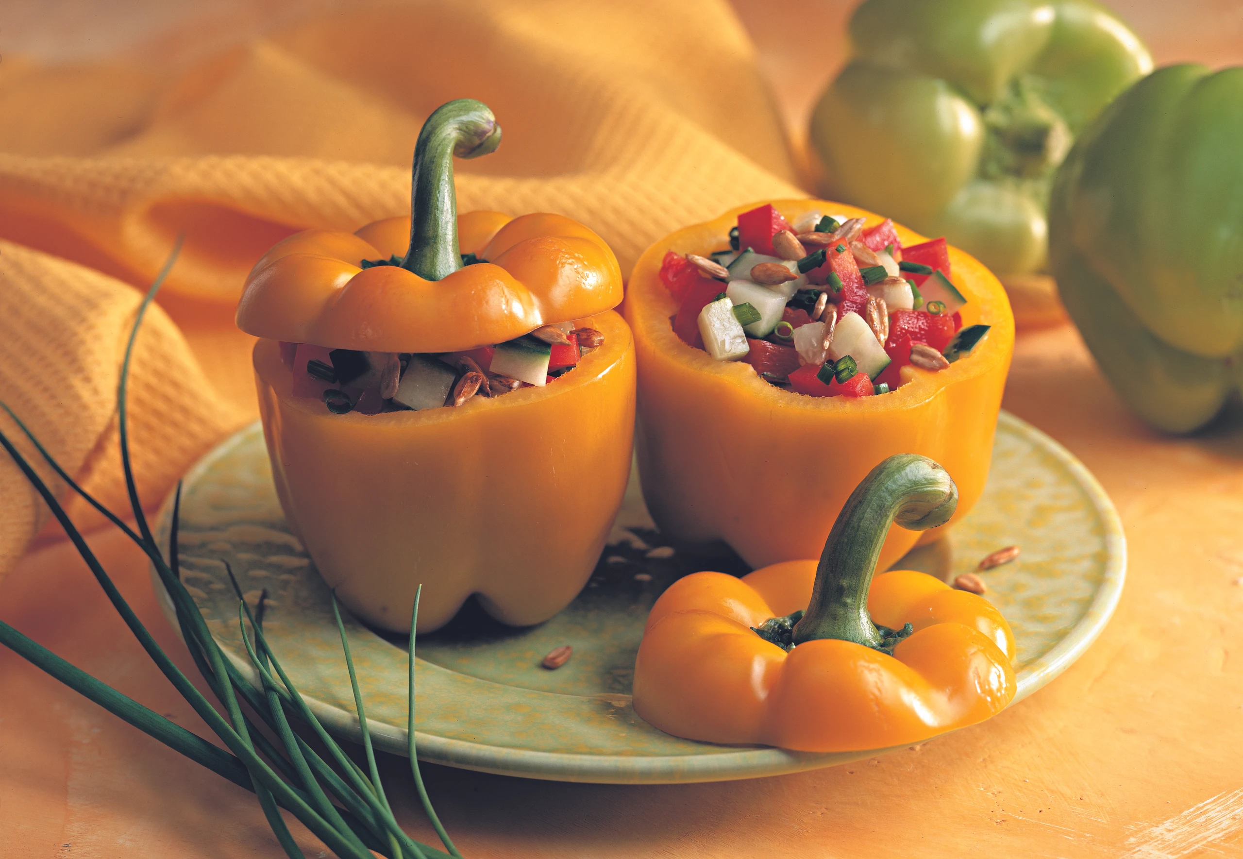 Salat in die gelben Paprika füllen, die Paprika-Deckel daraufsetzen.
