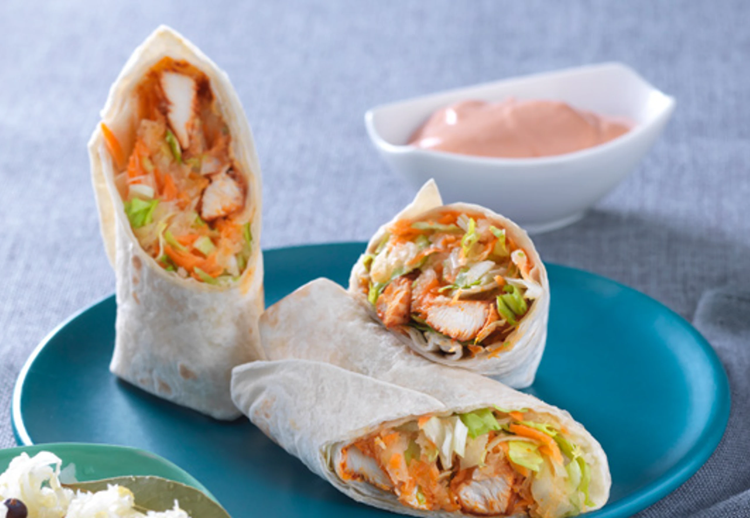 In die Mitte jeder Wrap-Tortilla ein Viertel der Gemüsemischung geben, Hühnerstreifen darauf verteilen. Tortillas rechts und links einschlagen und über die Fülle einrollen.