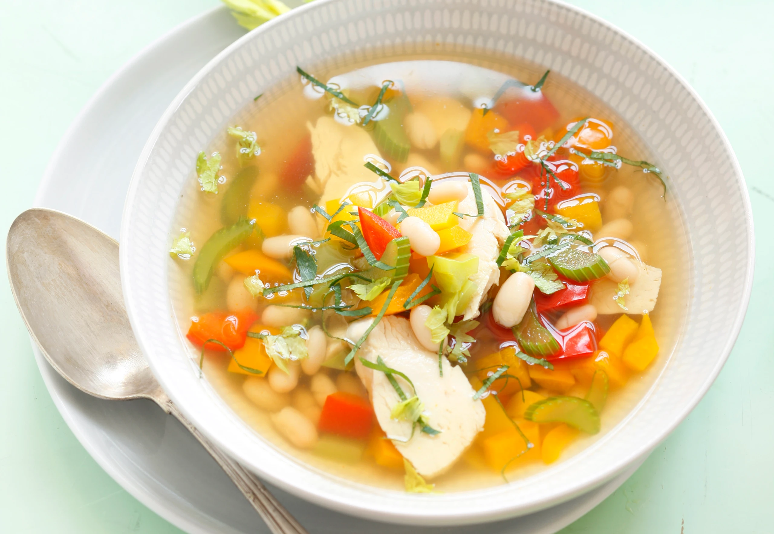 Suppe aufkochen, Paprika und Sellerie darin bissfest garen. Bohnen und Hühnerfleisch zugeben und erwärmen.