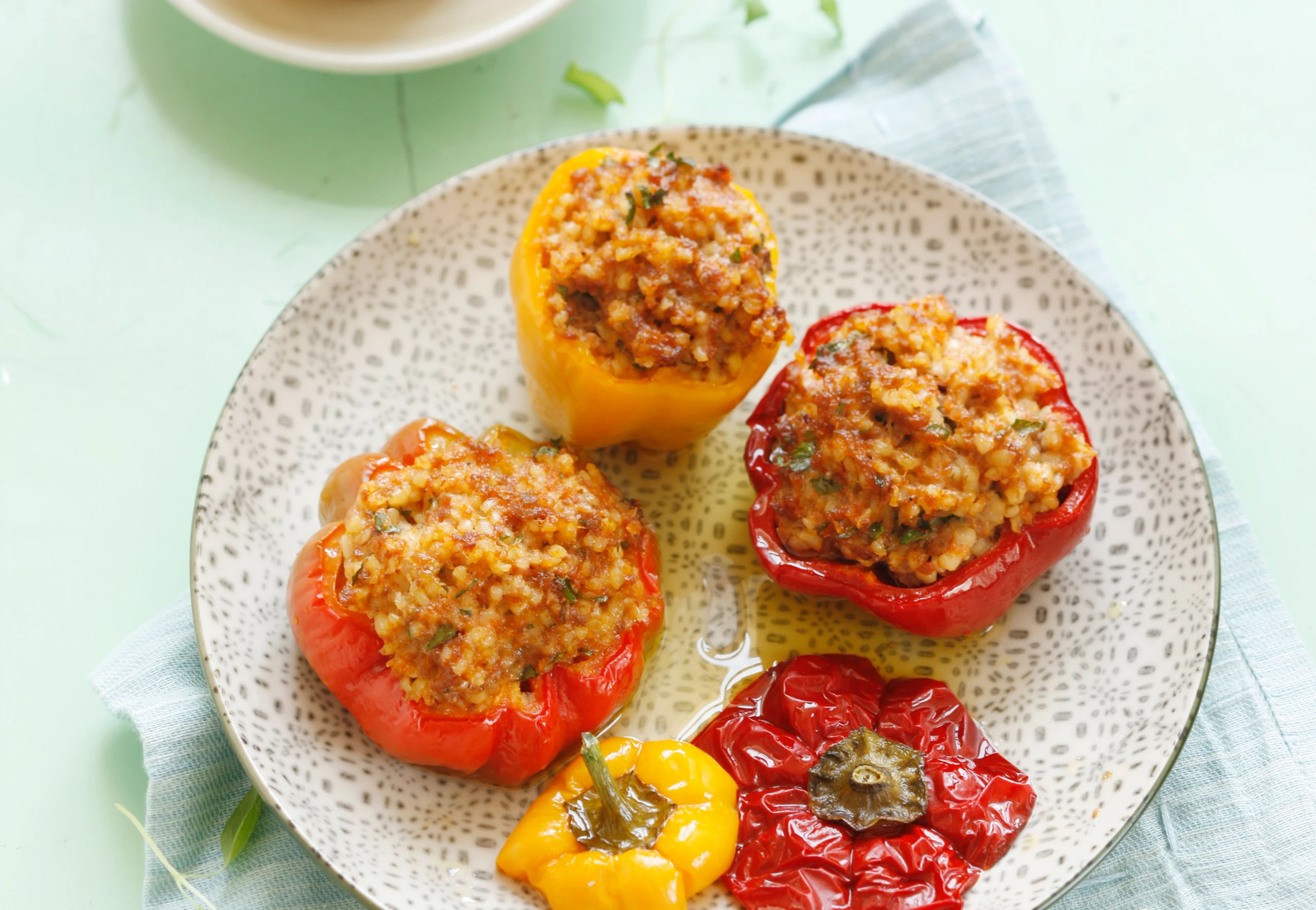 Paprika putzen, Kappen abschneiden, Kerne und Trennwände entfernen. Paprika mit der Bulgur-Fleischmasse füllen, Kappen aufsetzen, Paprika in eine Auflaufform geben. Form mit Wasser (1 cm hoch) füllen, Paprika mit Öl beträufeln und im Rohr (mittlere Schiene / Gitterrost) ca. 20 Minuten garen.