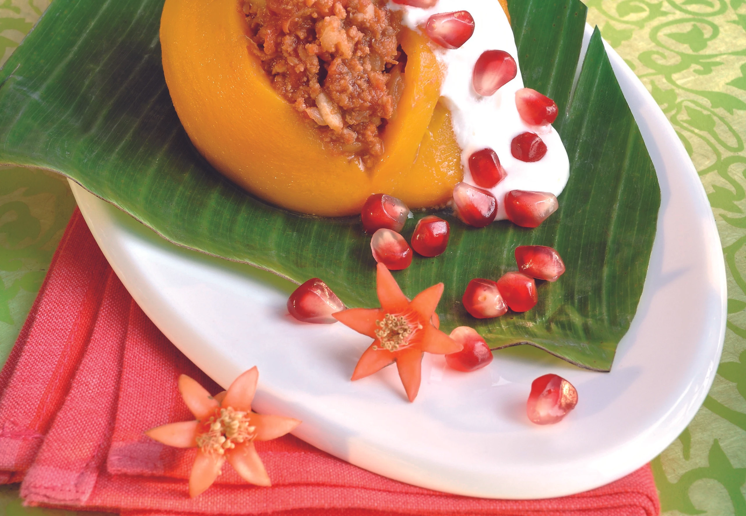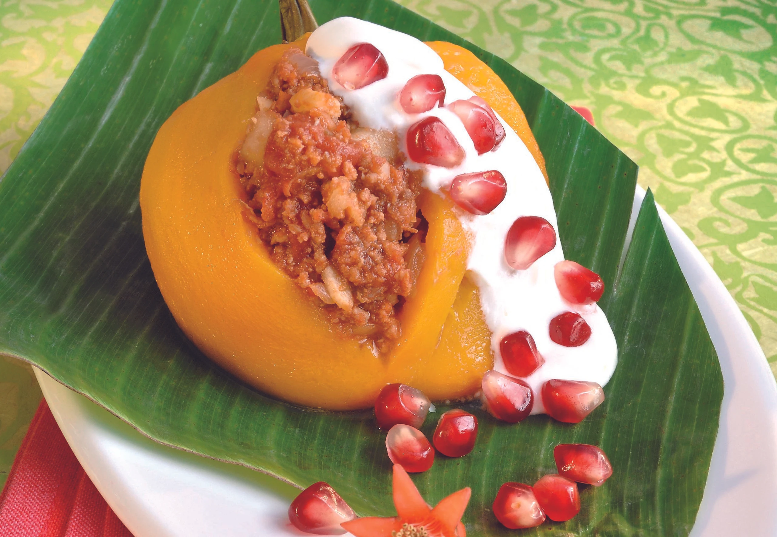 Paprika längs aufschneiden. Kerne entfernen, Haut abziehen. Paprika füllen, mit Rahm und Granatapfelkernen garnieren.
