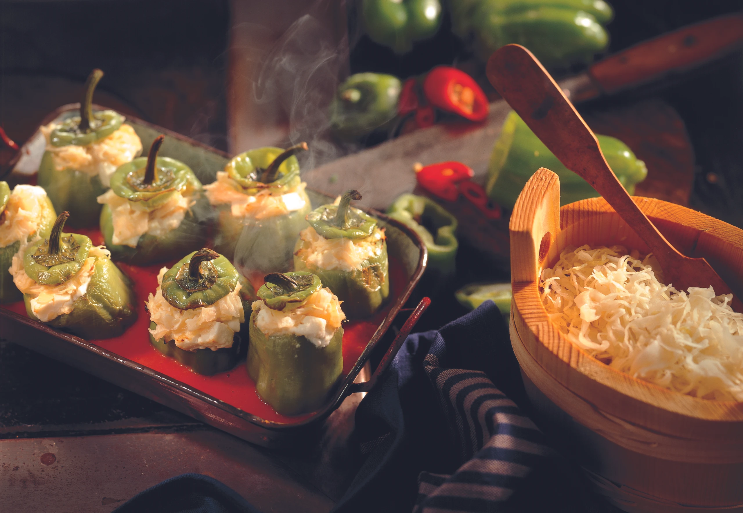 Paprika mit der Krautmasse füllen, die Fülle behutsam in die Schoten drücken, mit den Deckeln verschließen. Paprika in eine Auflaufform setzen, mit Suppe untergießen und im vorgeheizten Rohr ca. 35 Minuten garen.