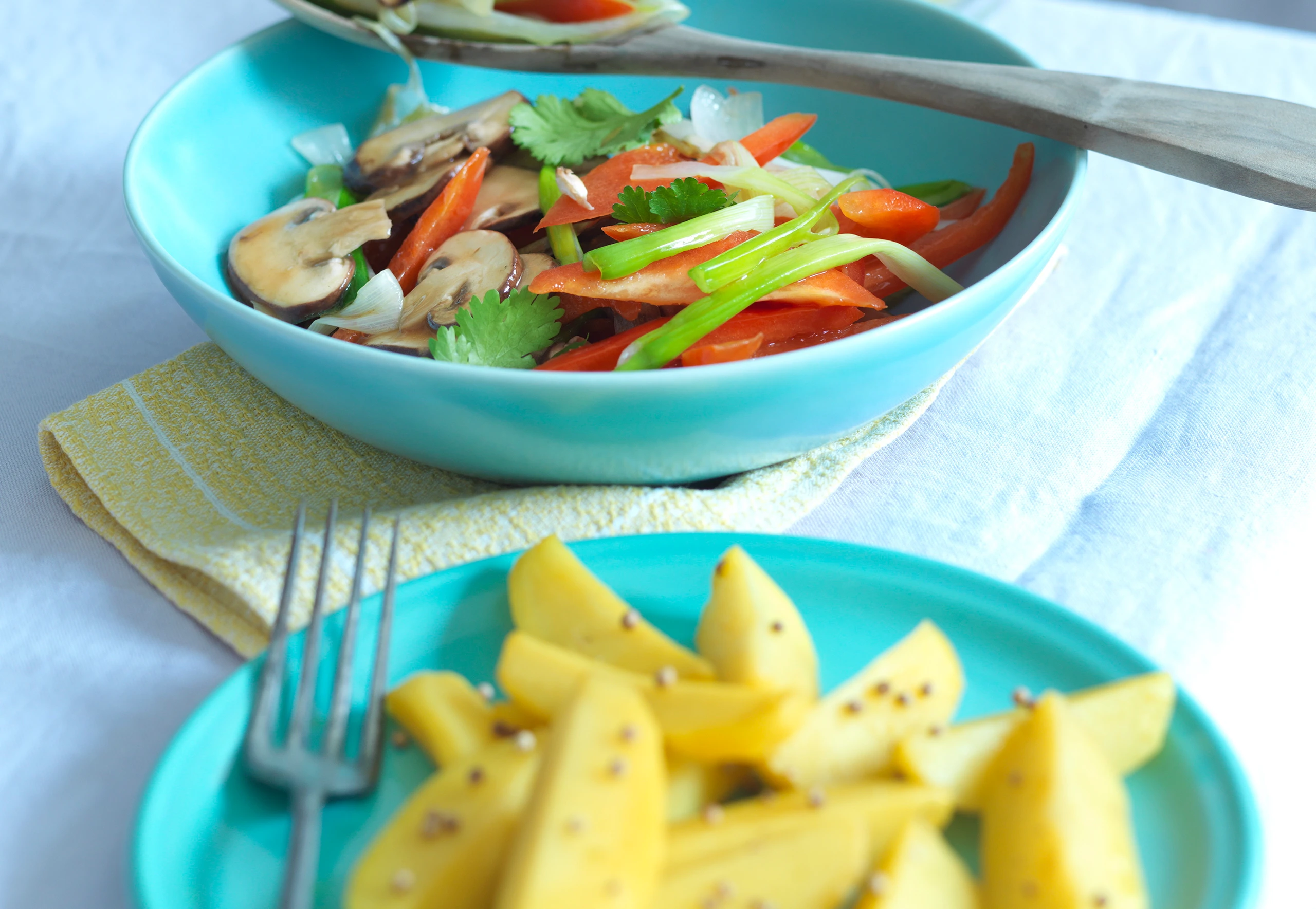 Paprika-Pilz-Wok mit Kurkuma-Erdäpfeln und Salat mit Petersildressing
