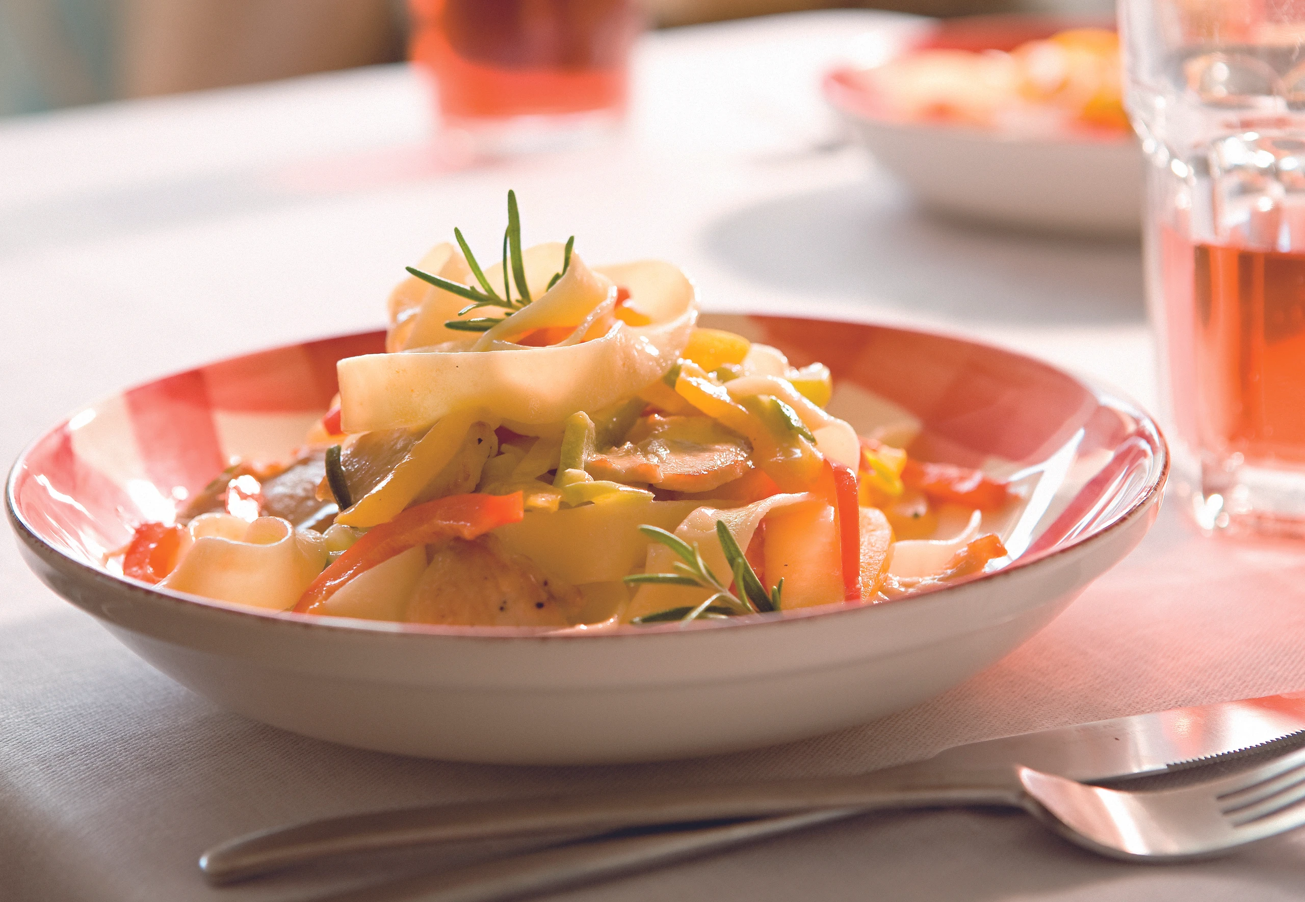 Fleisch in Olivenöl kurz anbraten, herausnehmen. Jungzwiebeln und Paprika im Bratrückstand schwenken, mit Suppe und Obers aufgießen, abgezupften Rosmarin zugeben, salzen und pfeffern. Putenscheiben zugeben und ca. 10 Minuten köcheln. Zuletzt die Bandnudeln untermengen.