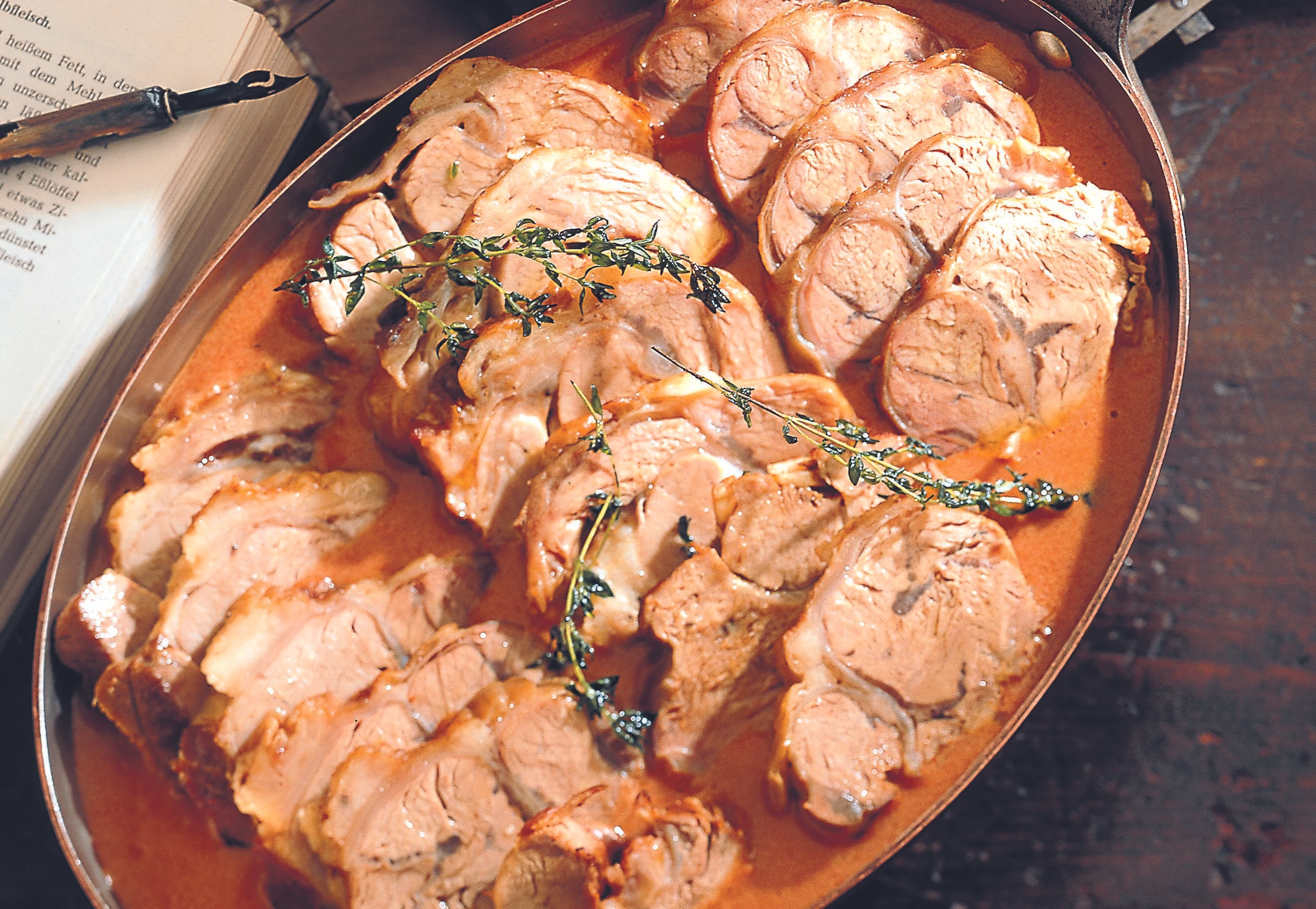 Zwiebeln schälen und klein würfelig schneiden. Fleisch in zwei Hälften schneiden, die Häute, die das Fleisch umgeben nicht entfernen. Fleischstücke einrollen, mit Spagat binden und mit Salz, Pfeffer und Thymian würzen. In Öl rundum anbraten, aus der Pfanne nehmen und beiseite stellen.