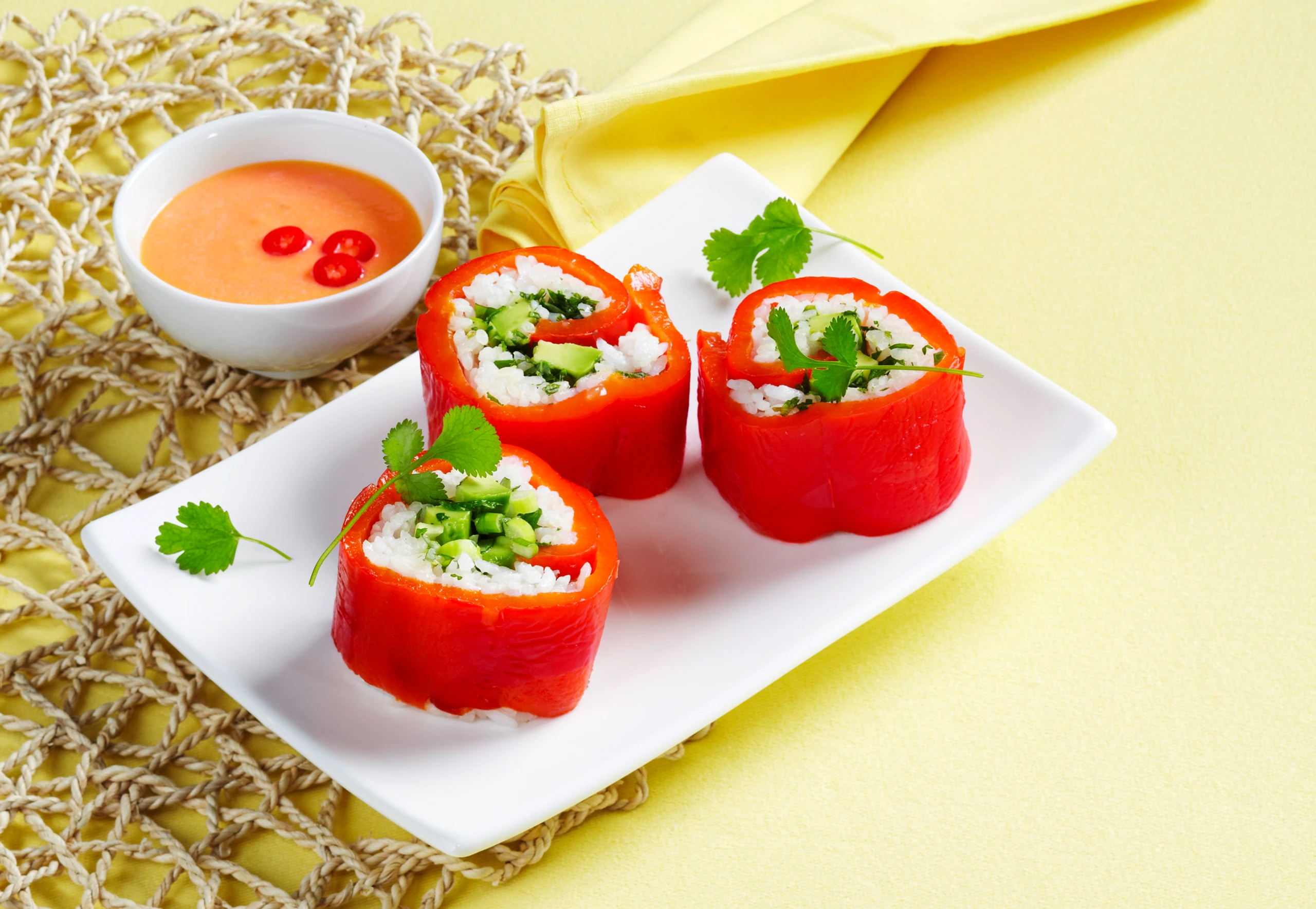 - Sushi-Matte mit Frischhaltefolie belegen, jeweils ein Paprikastück darauf legen, mit Reis bestreichen; dabei an einem Ende 2 cm frei lassen. Reis mit Jungzwiebel, Koriander und Avocado belegen. Paprika vom bestrichenen Ende her aufrollen, mit 2 Zahnstochern fixieren und halbieren. Eventuell mit Koriander anrichten, mit dem Dip servieren.