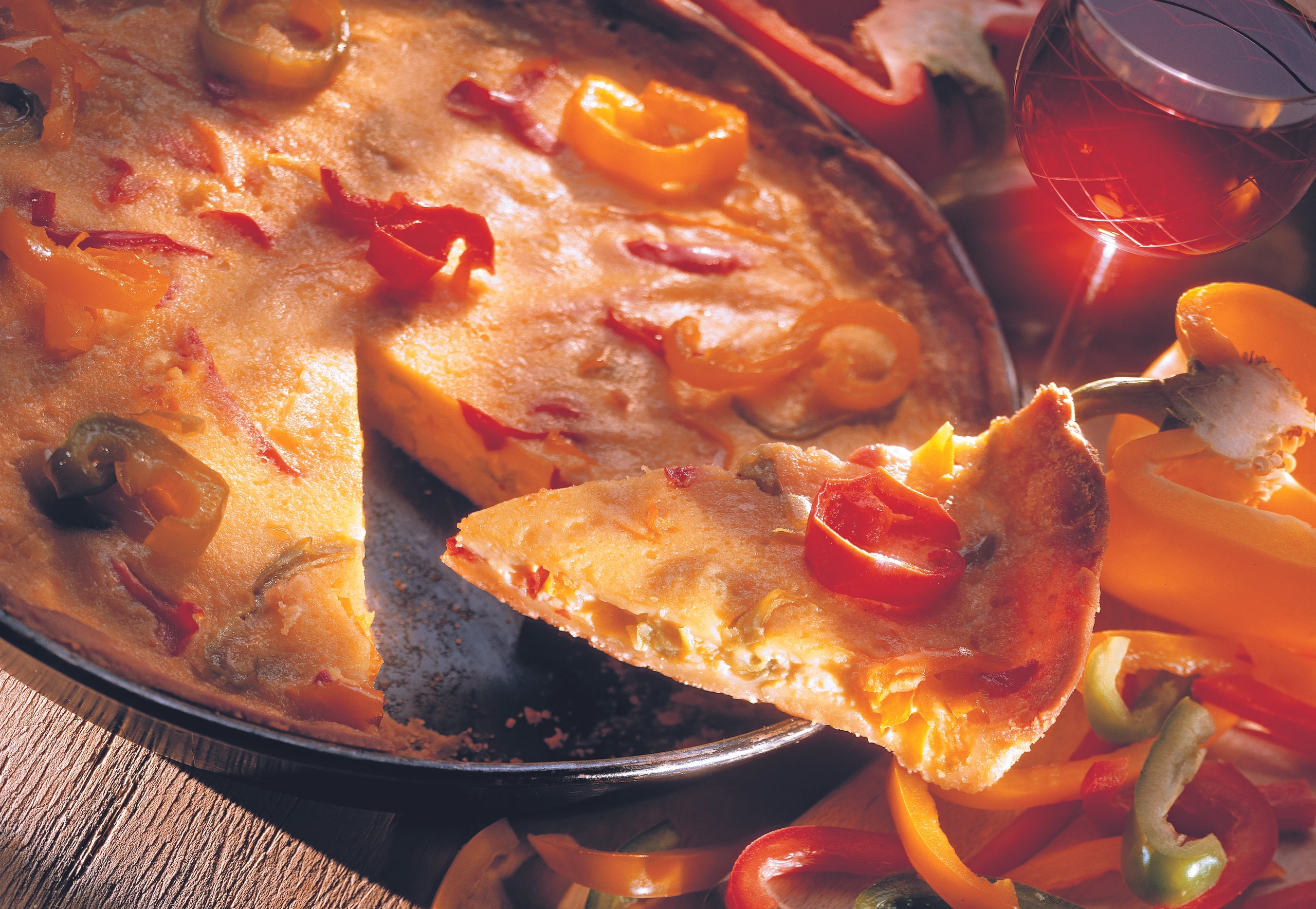 Dotter mit Milch, Obers, Zucker, Vanillezucker und Stärkemehl verquirlen und über die Paprika gießen. Kuchen im vorgeheizten Rohr (untere Schiene / Gitterrost) ca. 3/4 Stunden backen.