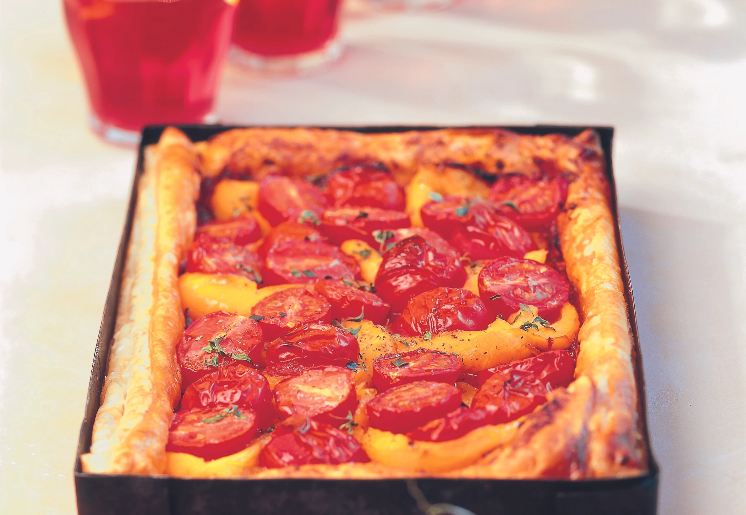 Blätterteig rechteckig (36 x 25 cm) ausrollen, auf das Backblech legen und mit der Tomaten-Kräuter-Creme bestreichen, dabei einen 3 cm breiten Rand frei lassen. Teig mit Paprika belegen, halbierte Tomaten darauf verteilen.