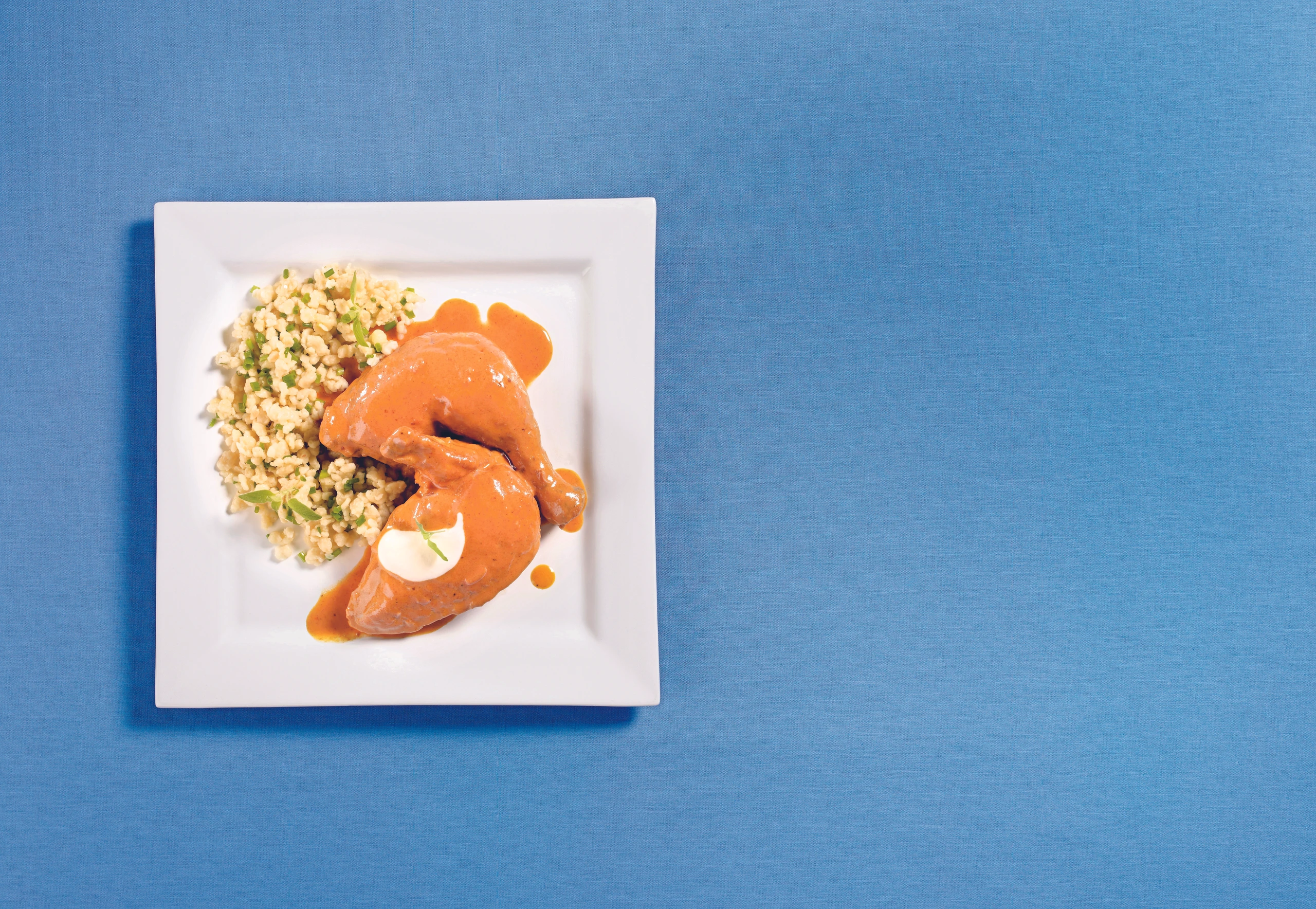 Fleisch herausheben. Sauerrahm mit Mehl vermischen und in die Sauce rühren. Sauce ca. 4 Minuten köcheln und mit einem Stabmixer pürieren. Fleisch zurück in die Sauce geben und kurz ziehen lassen. Als Beilage serviert man Tarhonya (ungarische Eiergraupen) oder Nockerl und Salat.