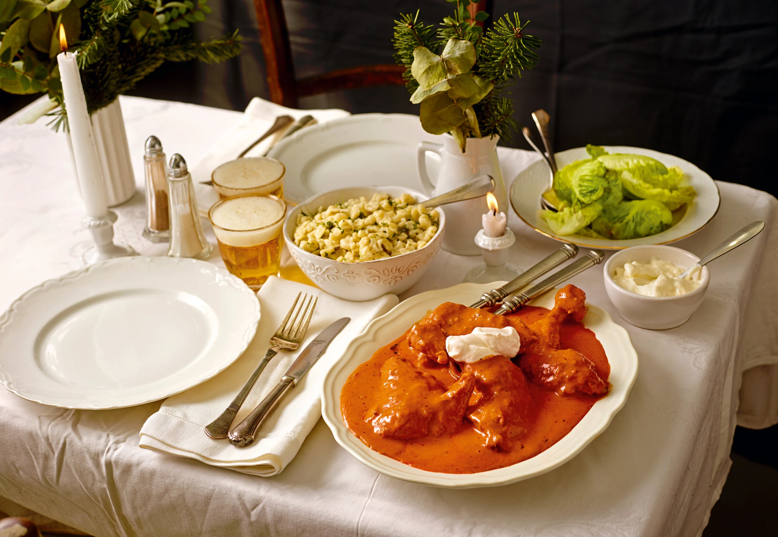 Paprikahendl mit Butternockerln und Salat