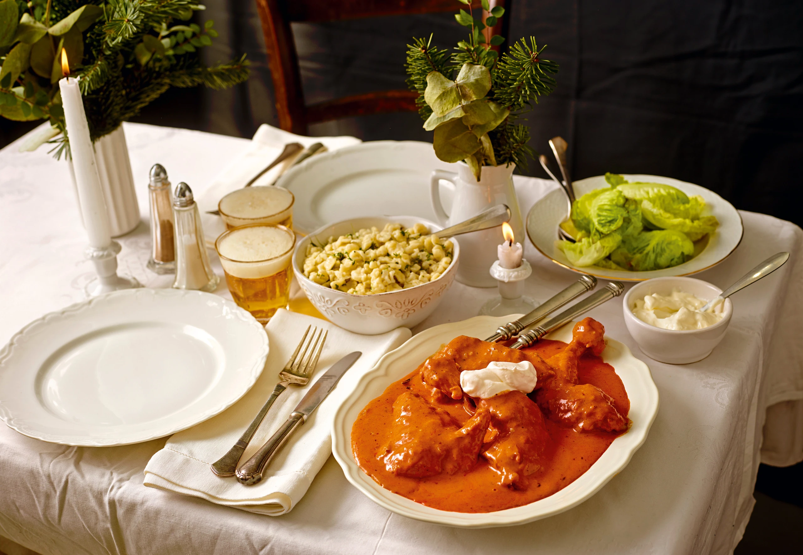 Nockerl in aufgeschäumter Butter schwenken, Kresse untermischen und salzen. Paprikahendl mit Nockerln anrichten und mit etwas Sauerrahm garnieren. Mit übrigem Sauerrahm und Salat servieren.