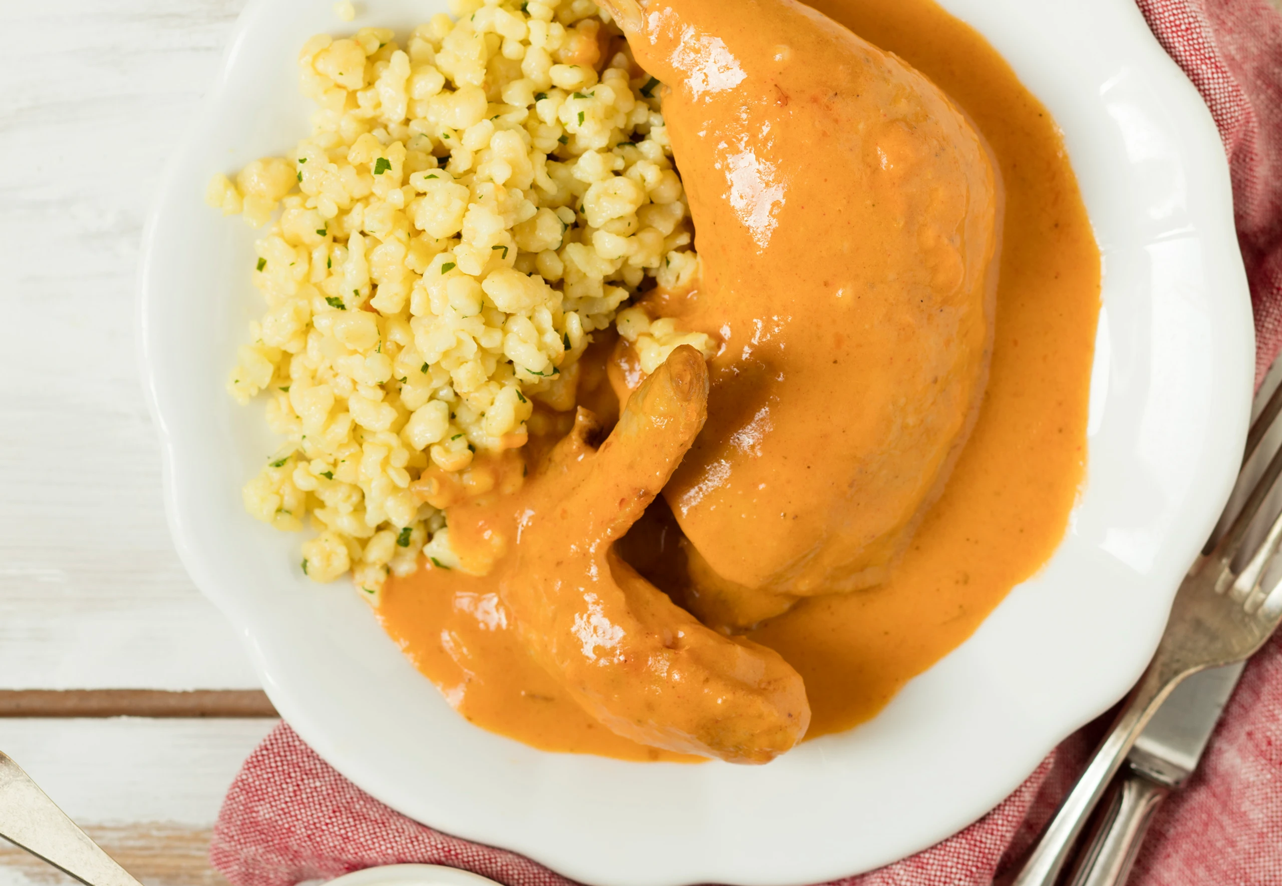 Fleisch herausheben. Rahm mit Mehl vermischen und in die Sauce rühren. Sauce ca. 4 Minuten köcheln und mit einem Stabmixer pürieren. Fleisch zurück in die Sauce geben und kurz ziehen lassen. Paprikahendl mit Kräuter-Tarhonya anrichten.