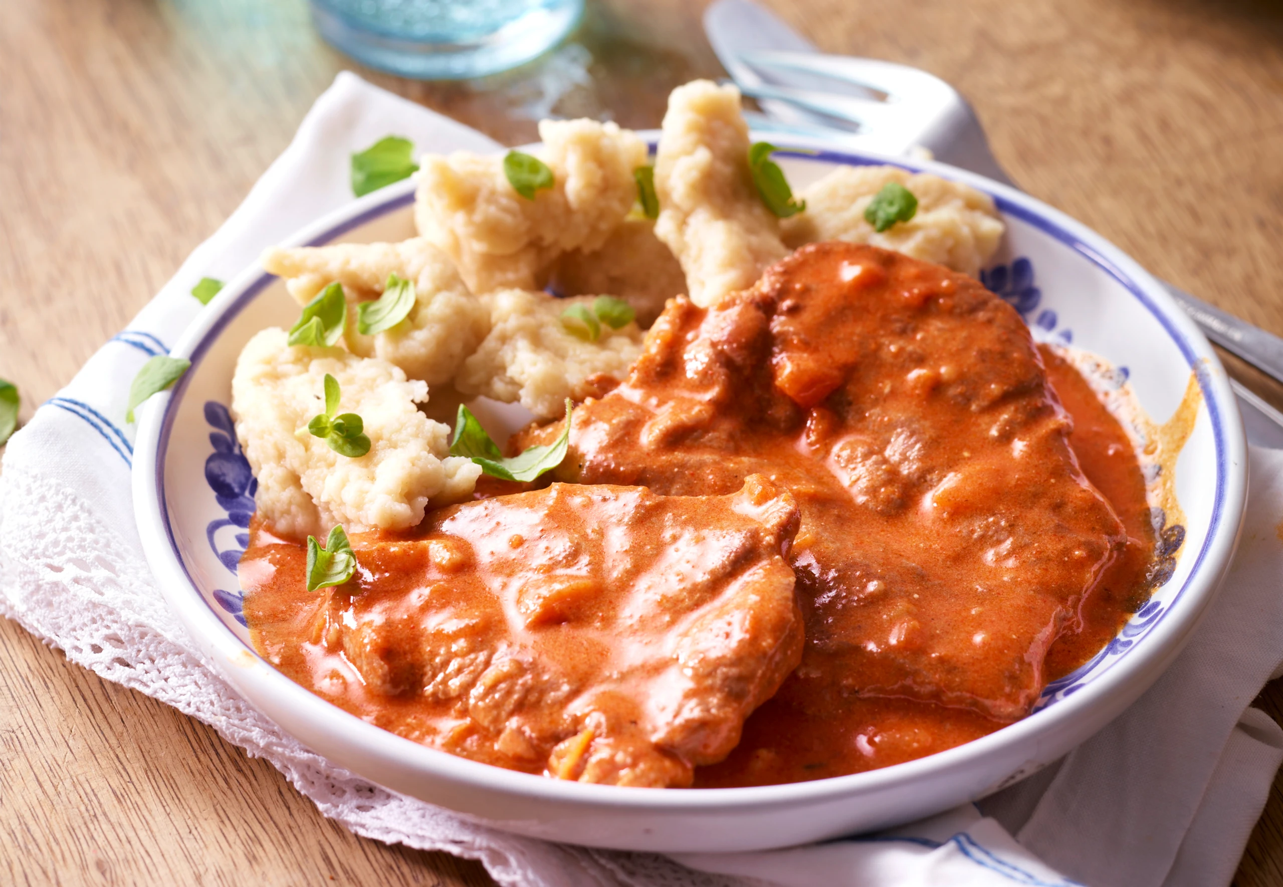 - Zwiebeln schälen und klein schneiden. Schnitzel salzen, pfeffern, in 3 EL Öl anbraten und aus der Pfanne nehmen. Im Bratrückstand Zwiebeln anrösten, Paprika einrühren und kurz mitrösten. Mit Suppe ablöschen und aufkochen. Rahm mit Mehl verquirlen, in die Sauce rühren und ca. 10 Minuten köcheln.