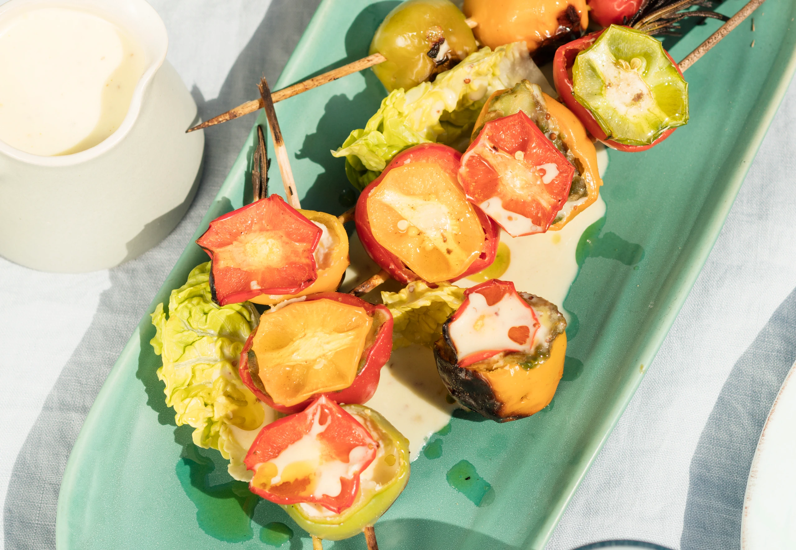 Spieße salzen, pfeffern, mit Öl bestreichen und beidseitig grillen. Spieße mit der Sauce anrichten und eventuell mit Salatblättern garnieren.