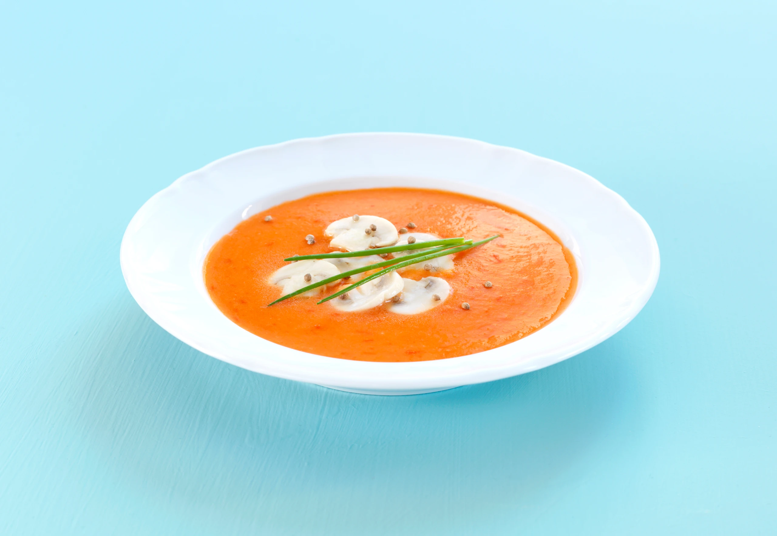 - In einer beschichteten Pfanne ½ EL Olivenöl erhitzen. Koriander darin kurz anrösten, Champignons zugeben, unter Rühren kurz braten und wenig salzen. Suppe portionsweise mit den Champignons anrichten, mit Schnittlauch bestreuen.
