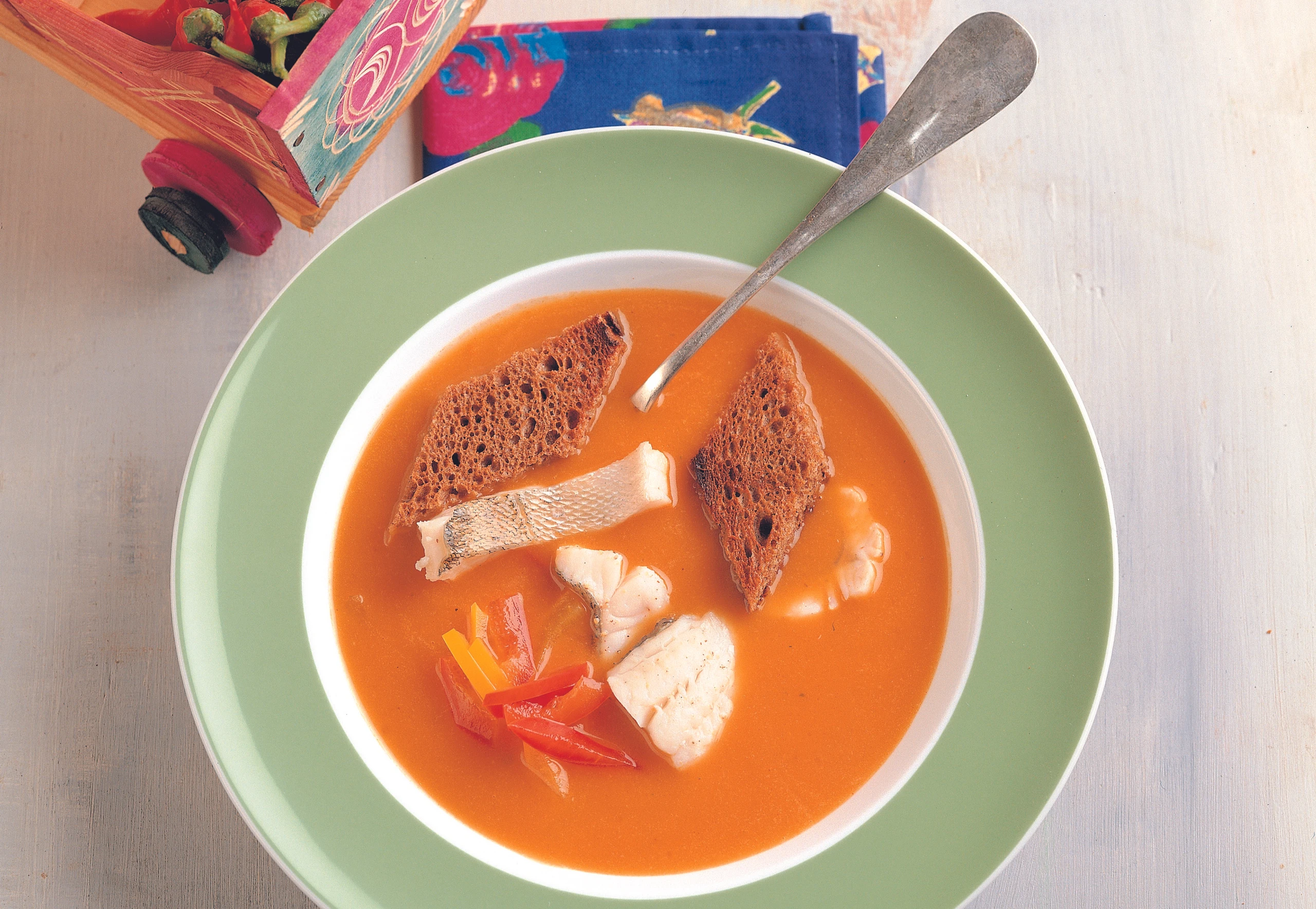 Fischsuppe fein pürieren, abseihen und erhitzen. Fischstücke salzen, in die Suppe geben und ca. 5 Minuten gar ziehen lassen. Suppe mit den Schwarzbrotkrusteln und eventuell mit gelben und roten Paprikastreifen garnieren.