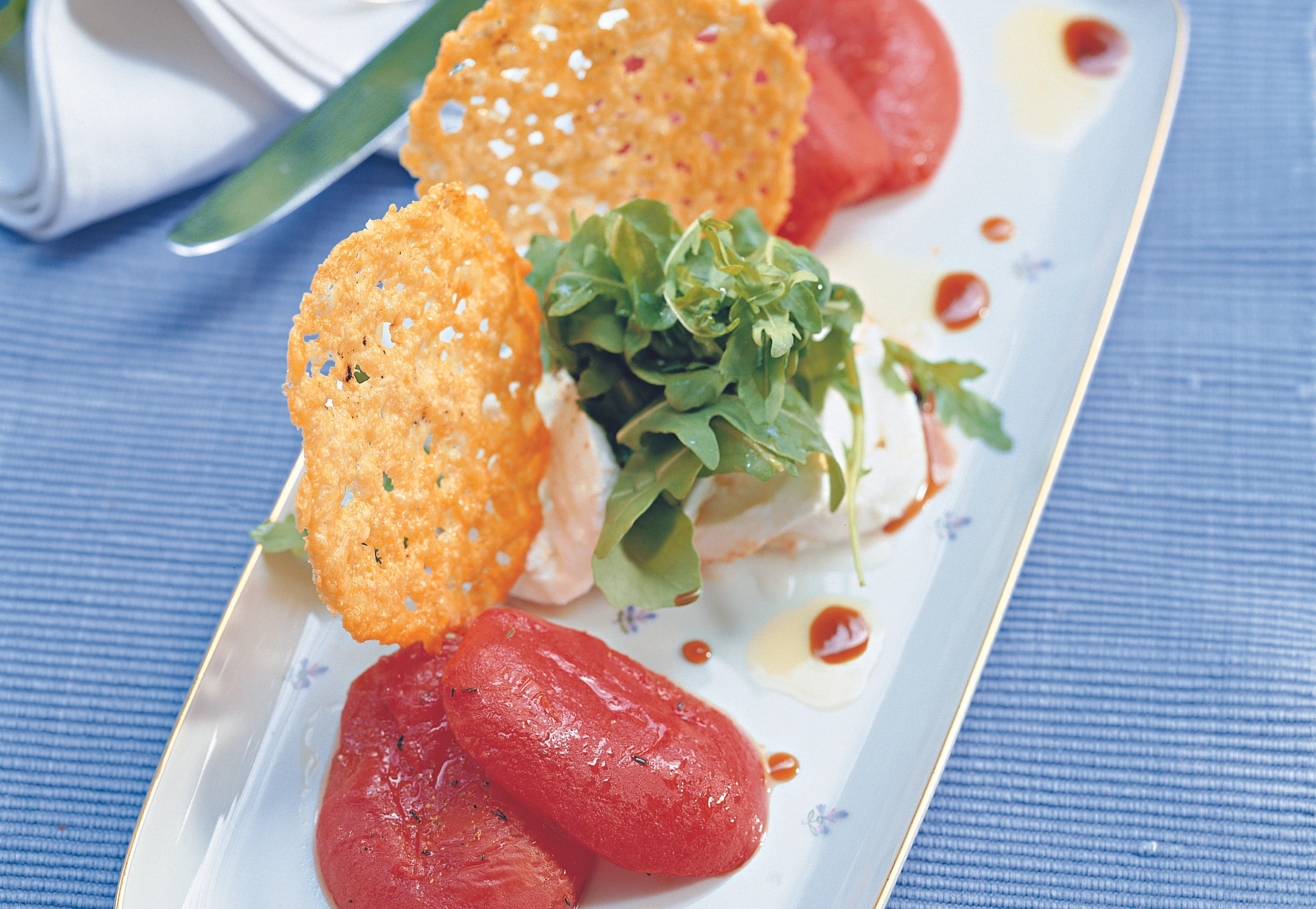 Mozzarella in Scheiben schneiden, mit den Paradeisern und Rucola anrichten. Die Crisps dazu servieren. Eventuell mit Olivenöl und Balsamico garnieren.