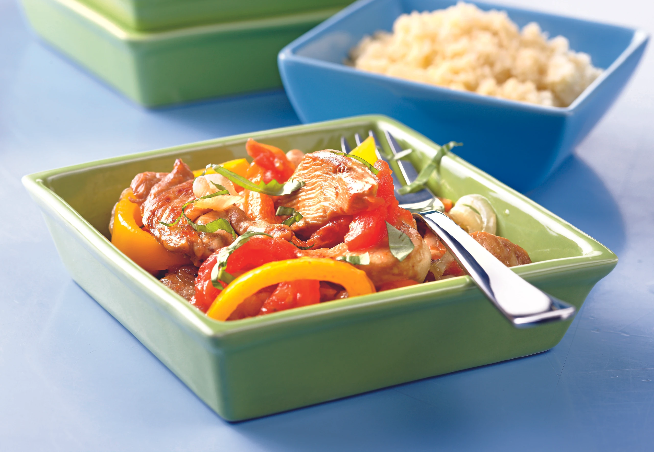 Fleisch untermischen. Paradeis-Paprika-Huhn kurz erhitzen, bis das Fleisch durch ist, dann mit Salz und Pfeffer abschmecken. Basilikum abzupfen, fein schneiden und untermischen. Dazu schmecken körniger Couscous oder Reis, aber auch Nudeln oder im Rohr gebackene Erdäpfel.