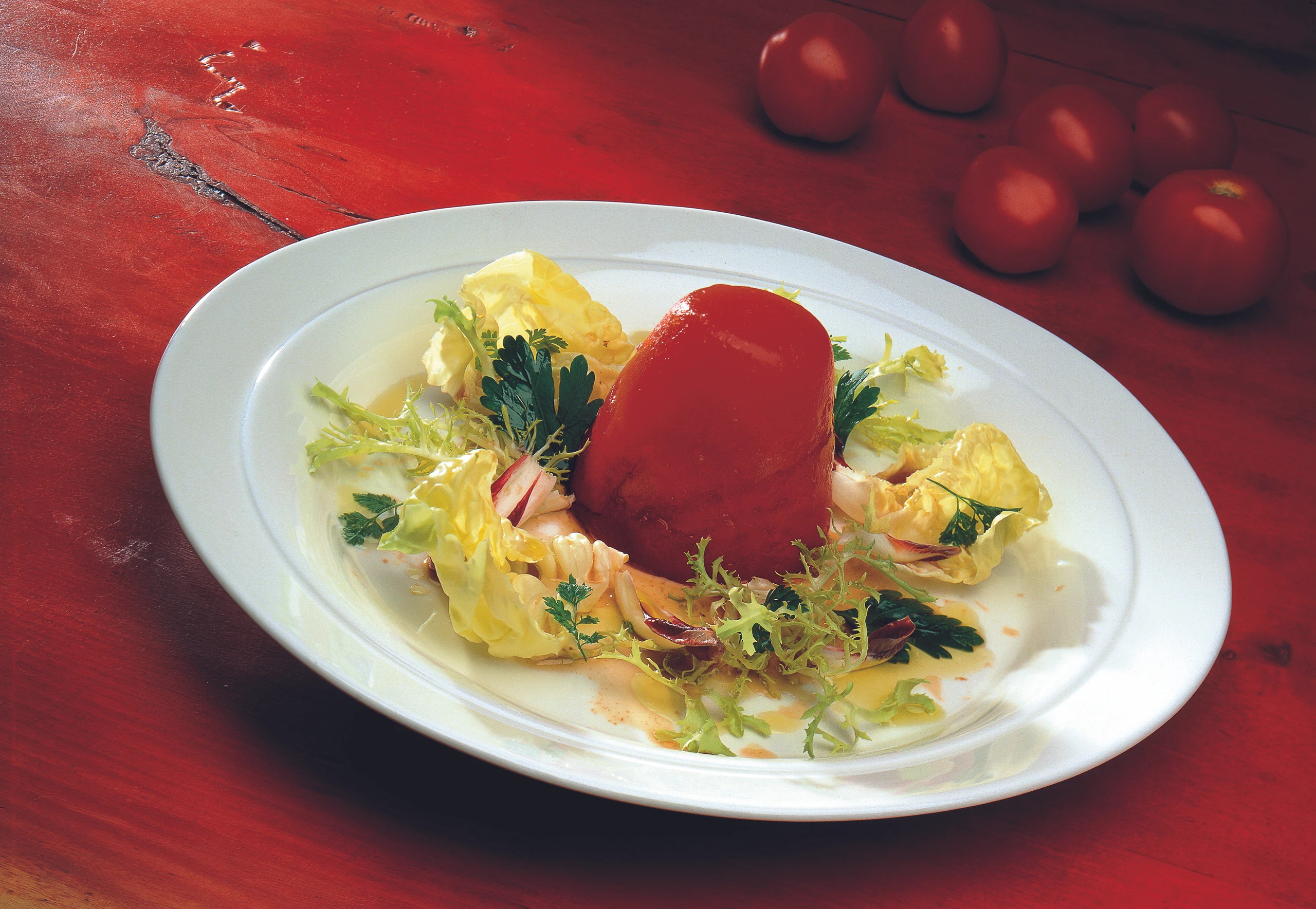 Ein wenig vom Püree über Wasserdampf erwärmen. Gelatine ausdrücken und darin auflösen. Mit dem restlichen Püree verrühren. Paradeiswürfel unterheben. Masse in die Förmchen füllen, mit Frischhaltefolie zudecken und zum Festwerden für ca. 6 Stunden in den Kühlschrank stellen.