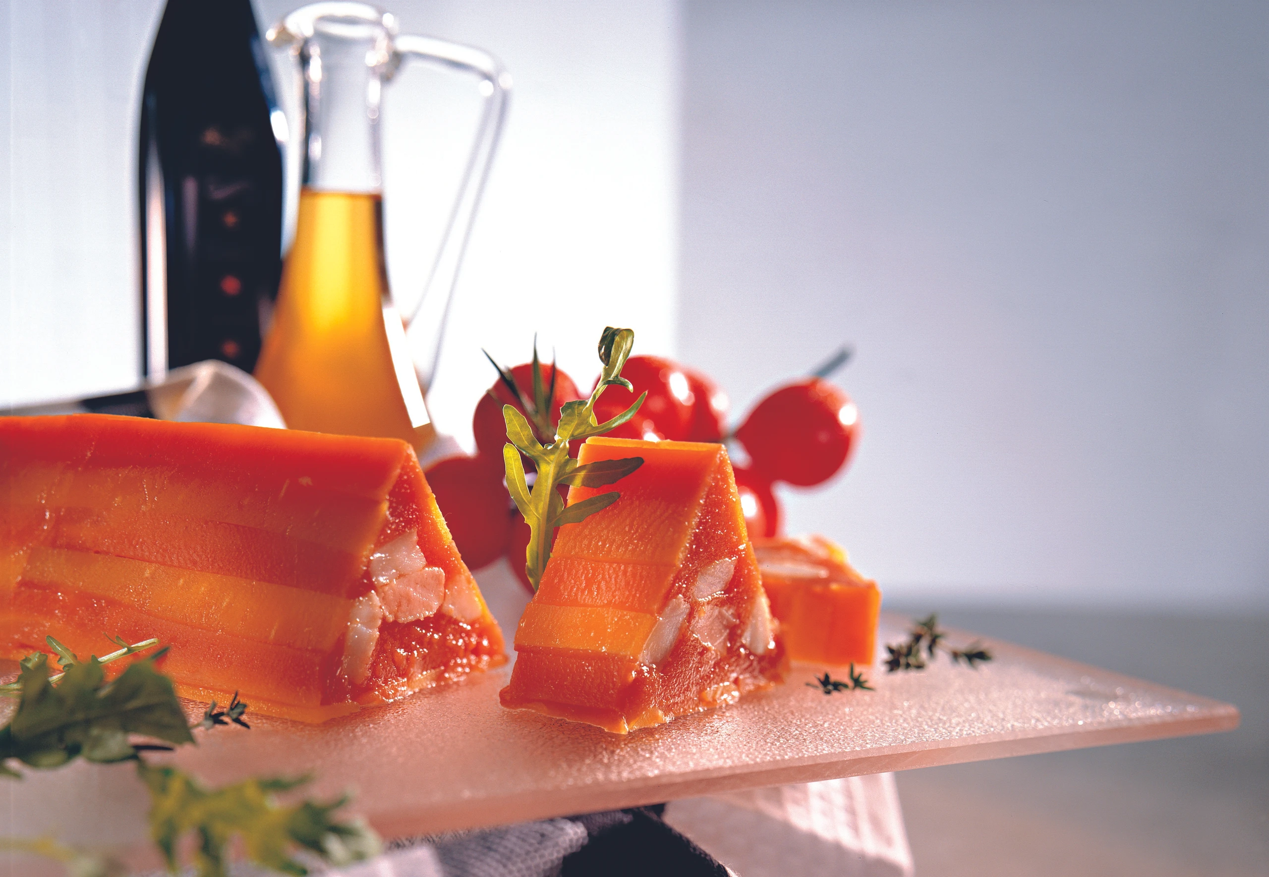 Gelatine in kaltem Wasser einweichen, gut ausdrücken und in der warmen Paradeissauce auflösen. Sauce 1 cm hoch in die Form füllen und im Kühlschrank ca. 1/2 Stunde anziehen lassen.