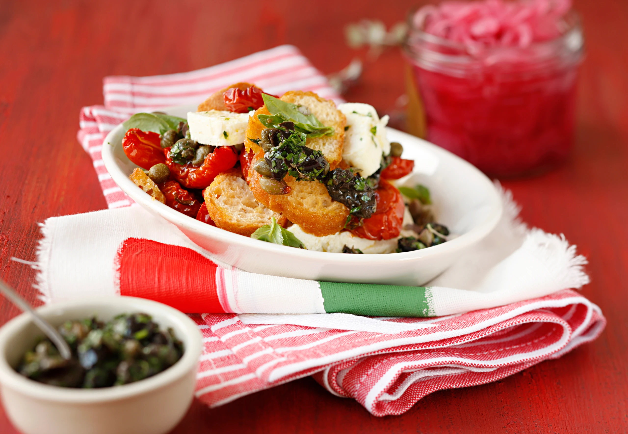 Für die Marinade Weißweinessig, 80 ml Olivenöl, Zitronensaft und Senf in ein Schraubglas füllen und kräftig schütteln. Für die Salsa Oliven, Petersilie und 4 EL Öl vermischen. Basilikumblätter abzupfen. Brotscheiben, Paradeiser, Kapern, Basilikum und Marinade vermischen, mit Ricotta und Olivensalsa anrichten.