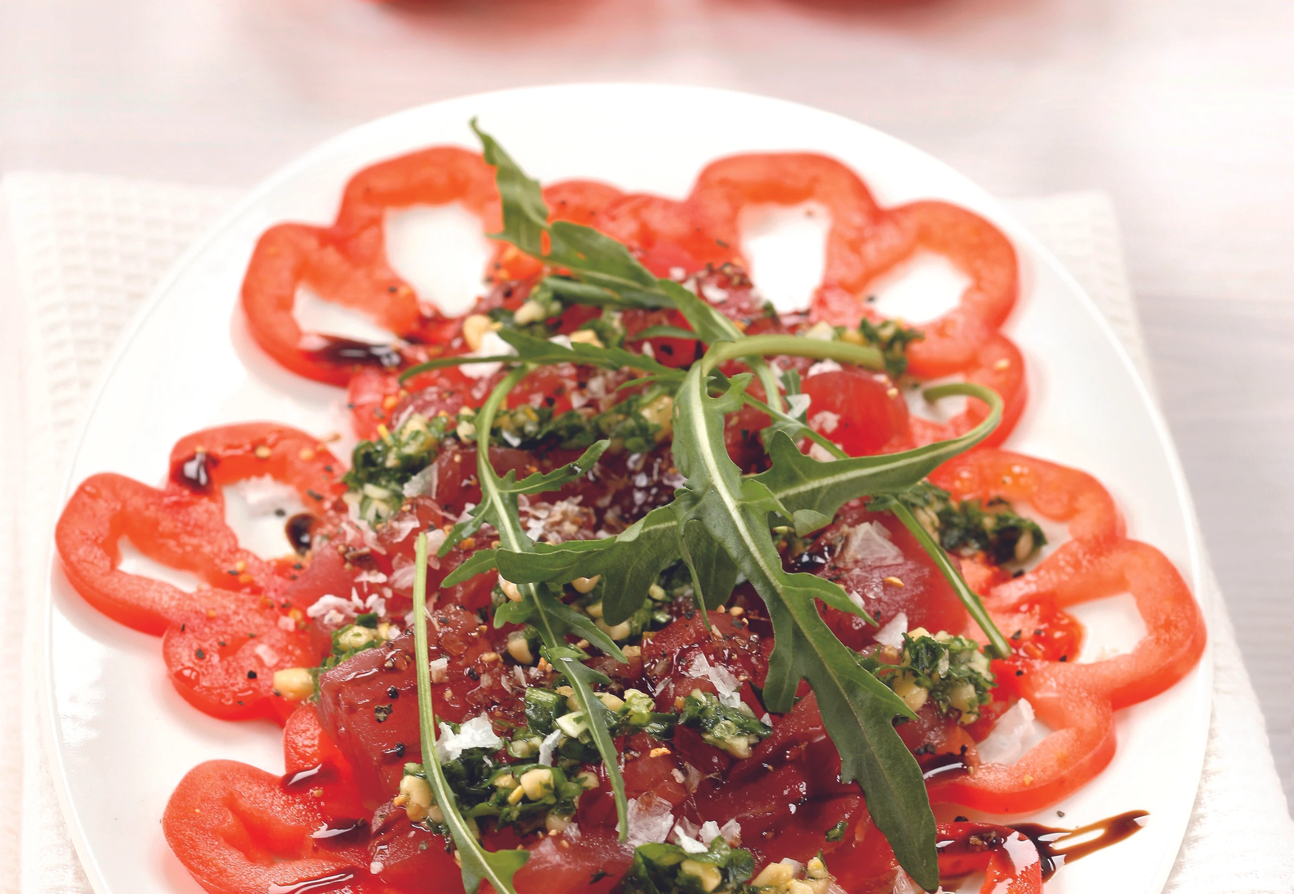 - Paradeiser quer in 5 mm dicke Scheiben schneiden, auf Teller legen, Thunfischtatar und Rucolapaste darauf verteilen. Mit Meersalz und Pfeffer bestreuen, mit Balsamico beträufeln, mit Rucola garnieren. Dazu passt Weißbrot.