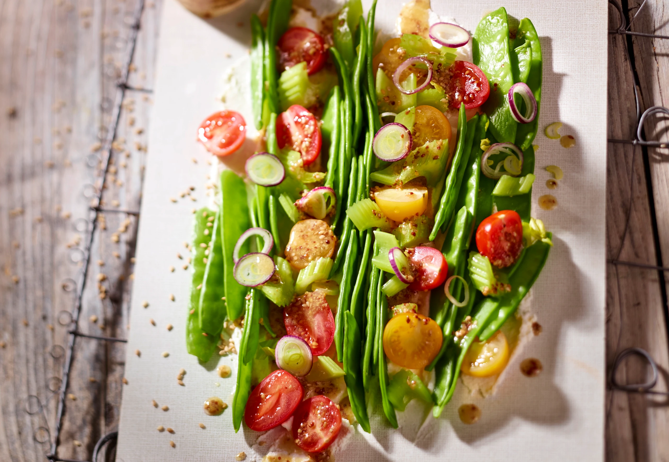 Teller mit Ricottacreme bestreichen, Gemüse dekorativ darauf anrichten, mit Dressing beträufeln.