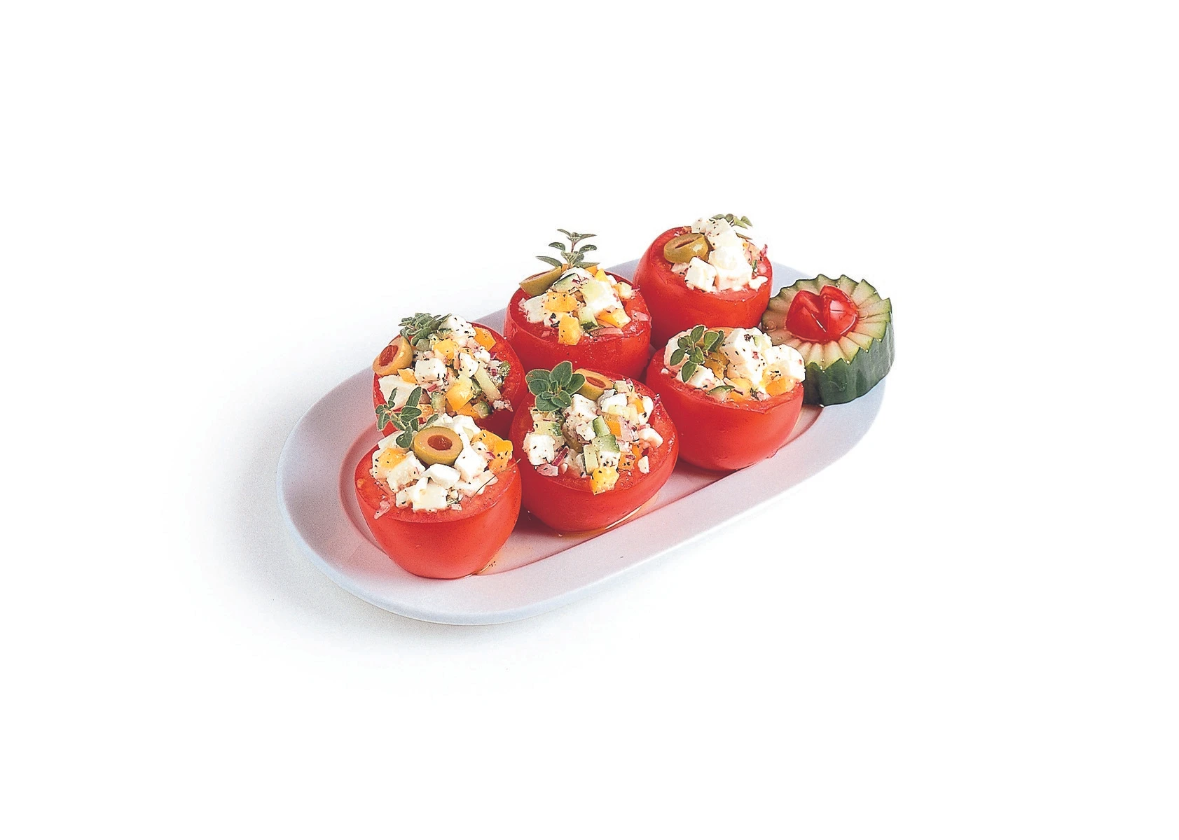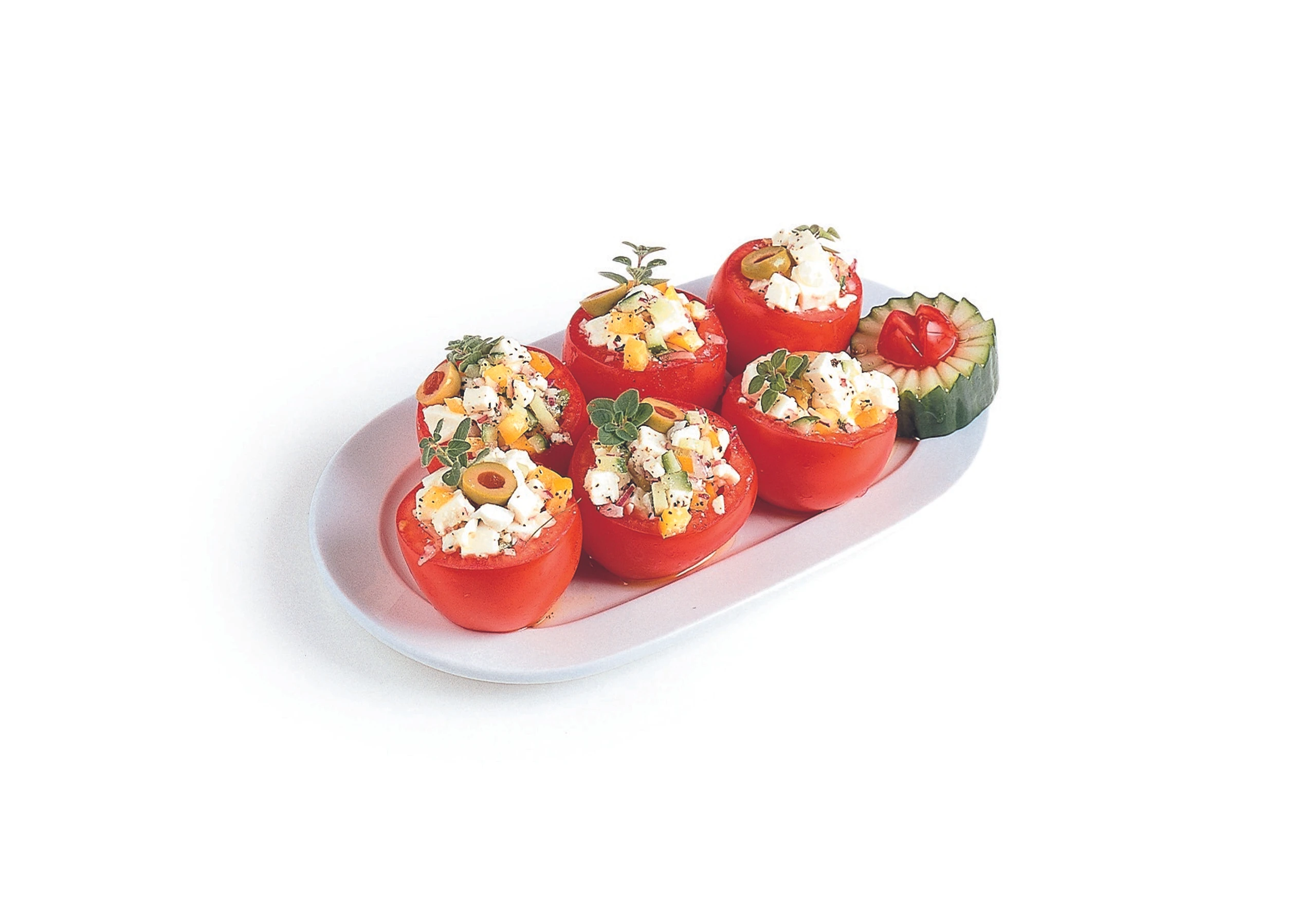Käse abtropfen lassen. Zwiebel schälen. Käse, Zwiebel, Gurke und Paprika klein würfelig schneiden und untermischen. Mit Öl und Balsamico marinieren, mit Salz, Pfeffer und geschnittenem Oregano abschmecken. Paradeiser damit füllen und garnieren.