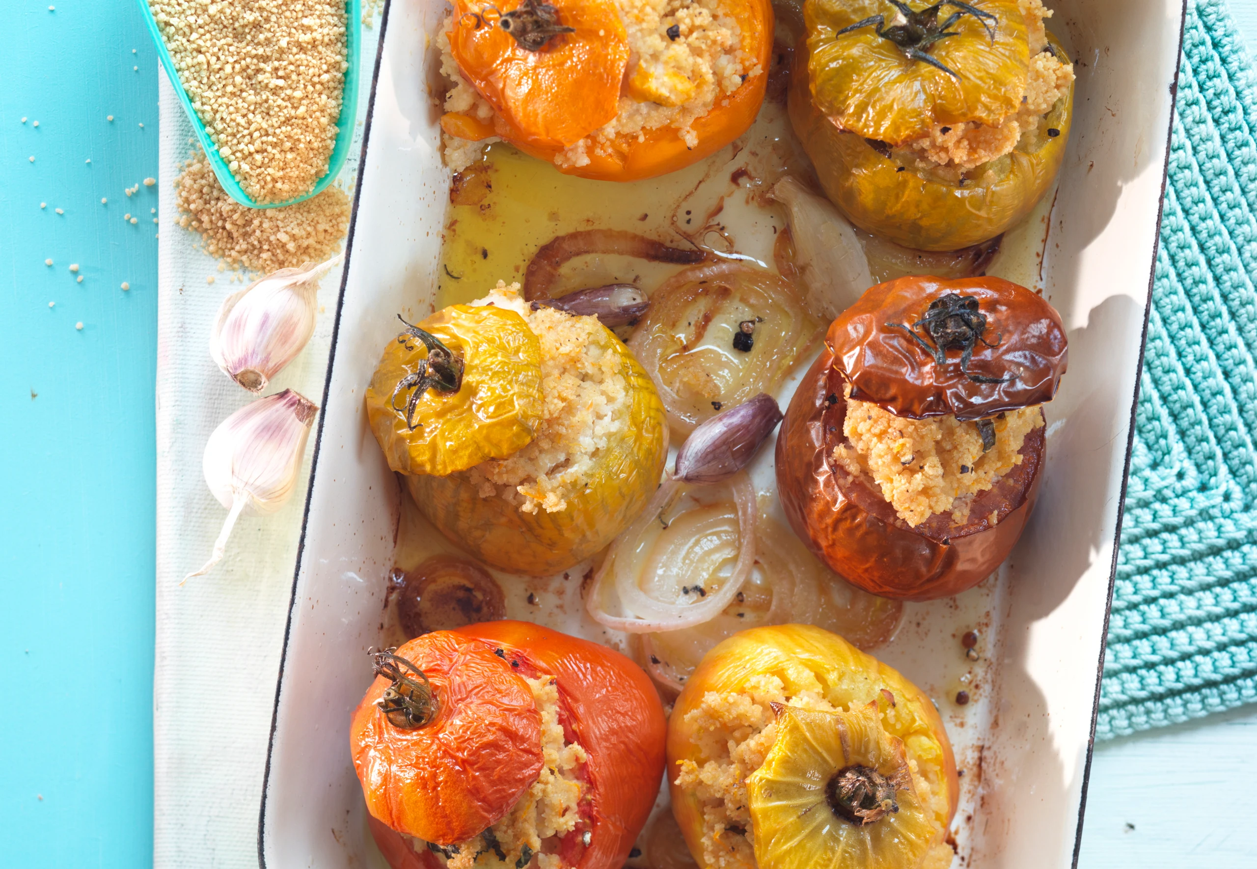 Von den Paradeisern die Kappen abschneiden und beiseite legen. Paradeiser aushöhlen (am besten mit einem Kugelausstecher) und mit der Couscousmasse füllen.