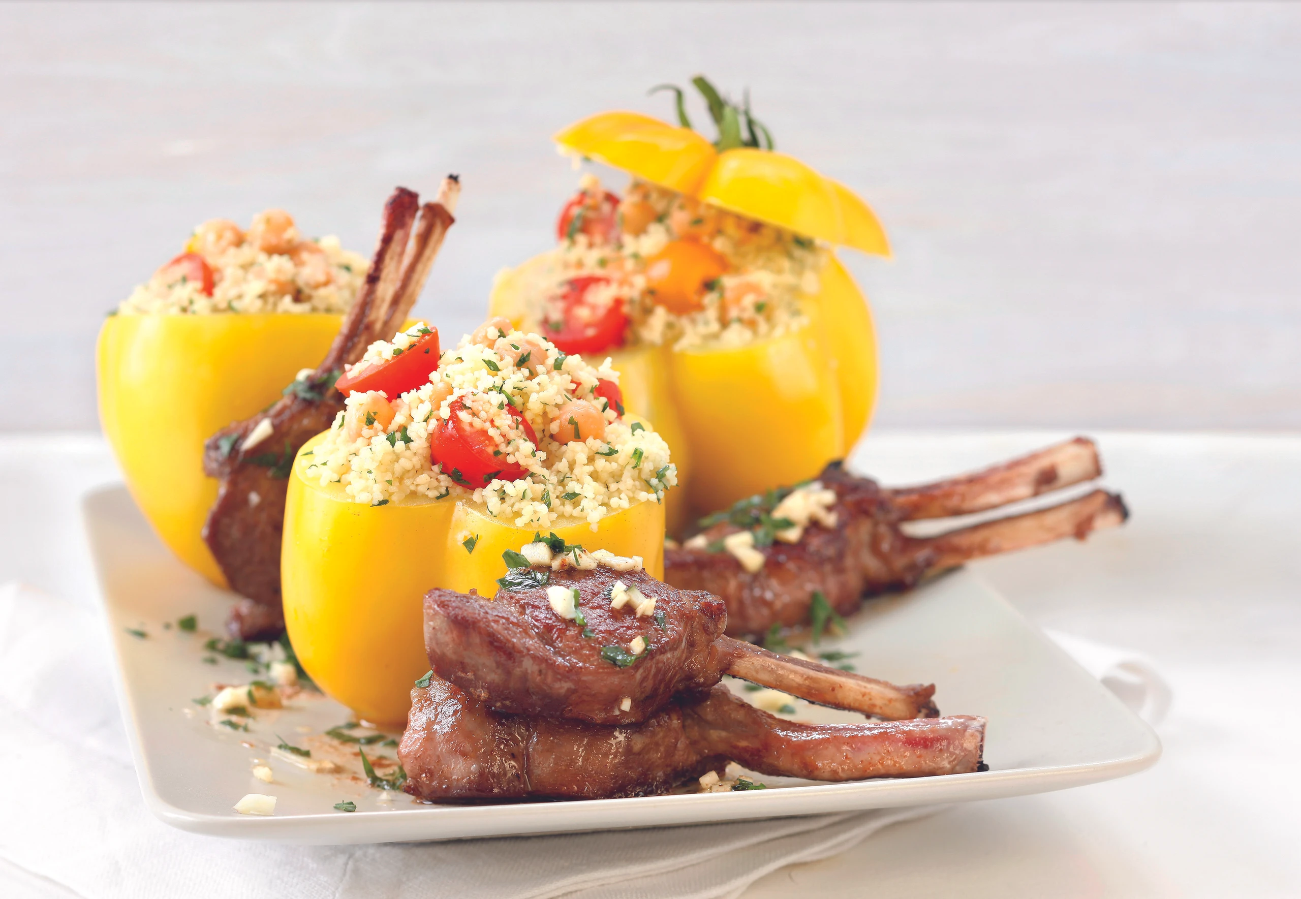 Paradeiser mit Couscousfülle und gebratene Lammkoteletts