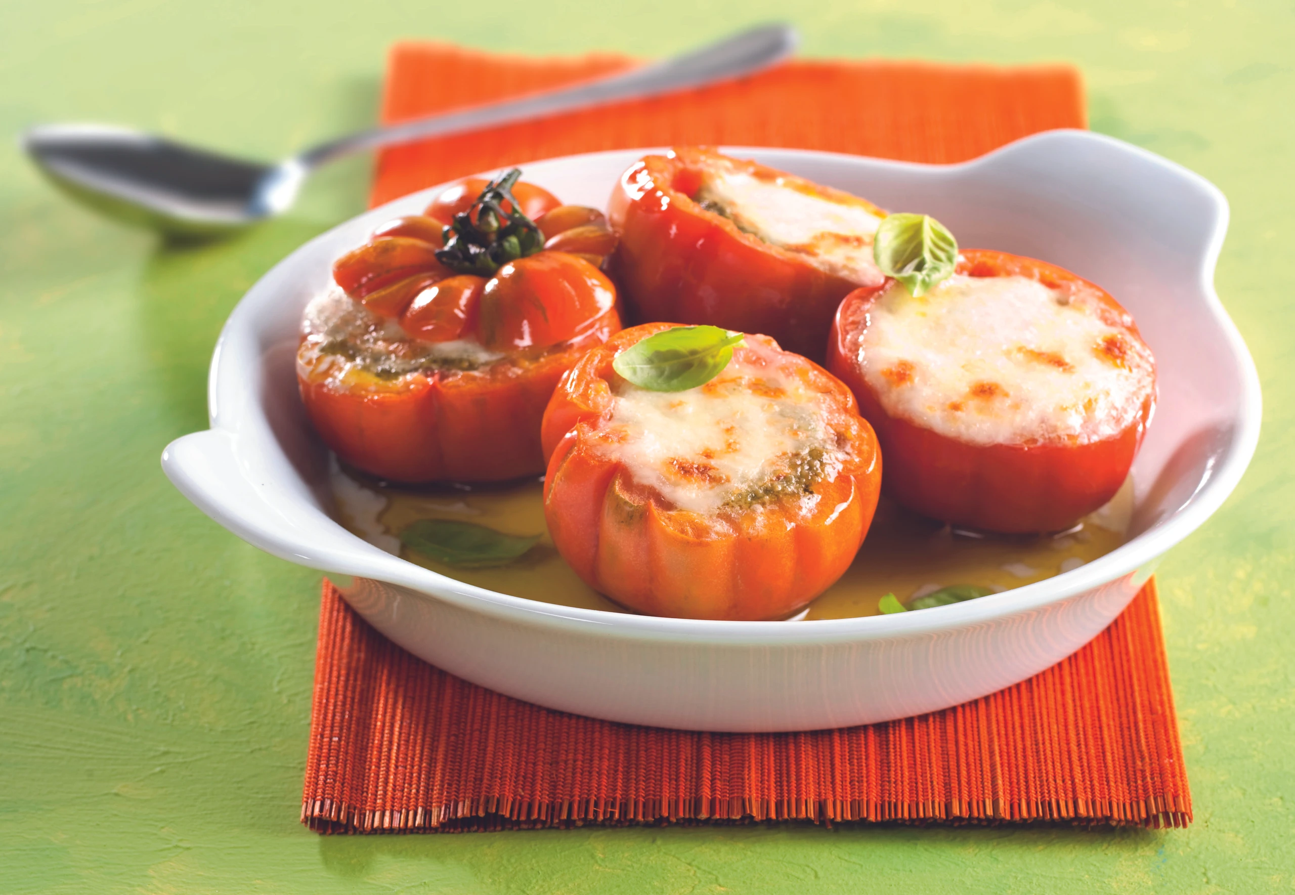 Rohr auf Grillstellung vorheizen. Auflaufform mit Butter ausstreichen. Paradeiser salzen, pfeffern und in die Form setzen. Mit dem Pesto füllen und mit Mozzarella belegen. Deckel seitlich in die Form legen. Paradeiser im Rohr (untere Schiene / Gitterrost) ca. 15 Minuten überbacken.