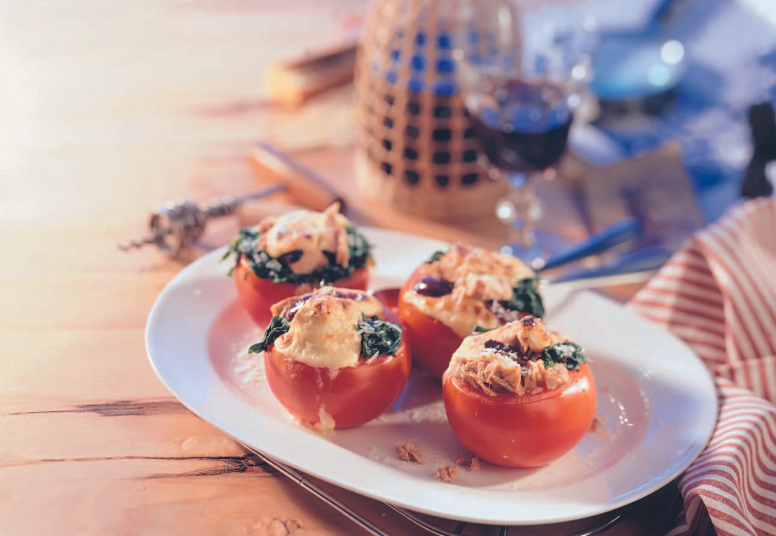Paradeiser mit Spinat, dann mit Thunfisch füllen, in die Auflaufform geben, mit Oliven garnieren, mit Sauce überziehen und im vorgeheizten Rohr (mittlere Schiene / Gitterrost) 10-12 Minuten überbacken - die Sauce sollte hell gebräunt sein. Dazu serviert man Baguette oder gekochte Erdäpfel.