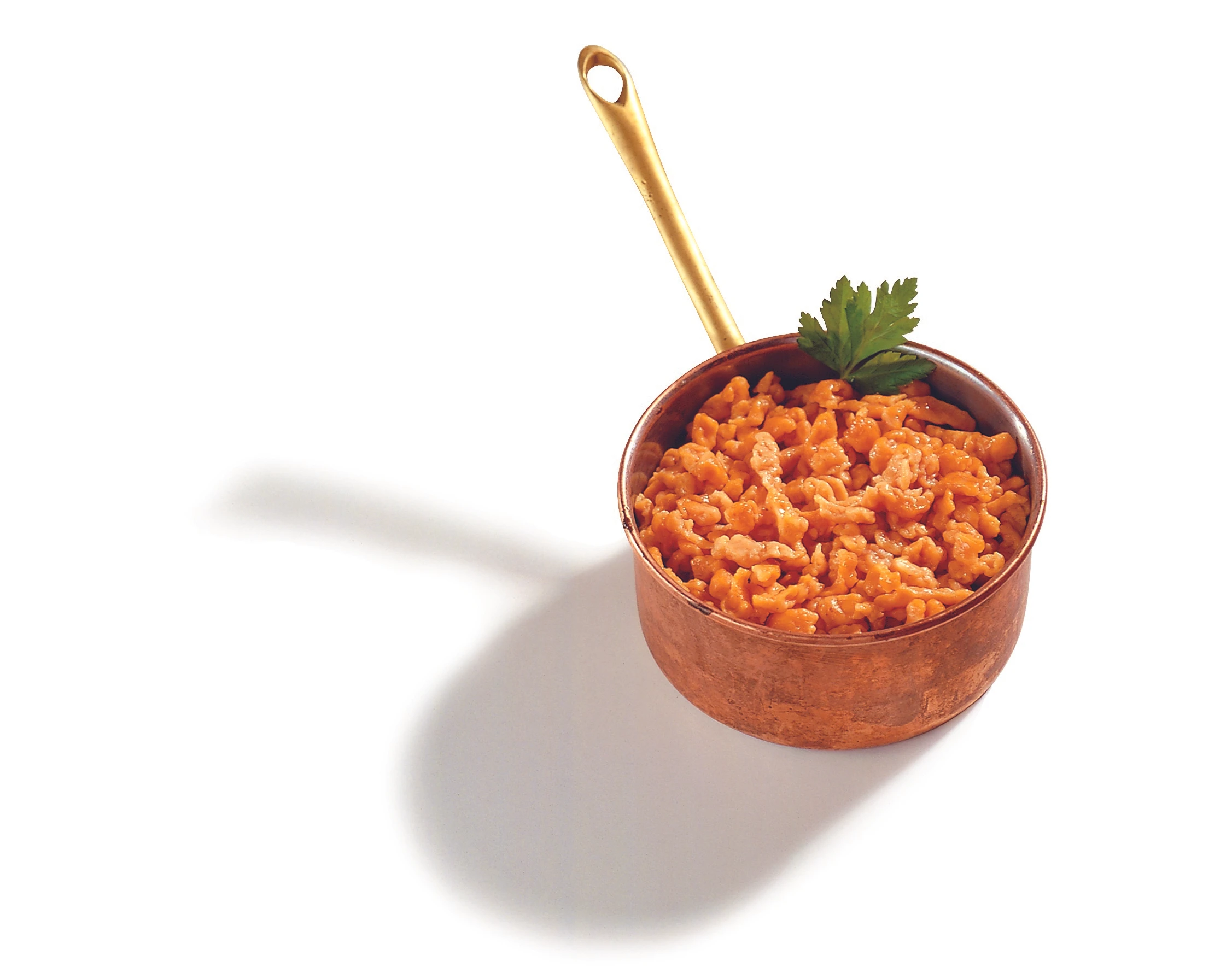Mehl in eine Schüssel sieben, Butter, Eier, eine Prise Salz und Paradeissaft zugeben, mit einem Kochlöffel zu einem glatten Teig abschlagen. Reichlich Salzwasser aufkochen.