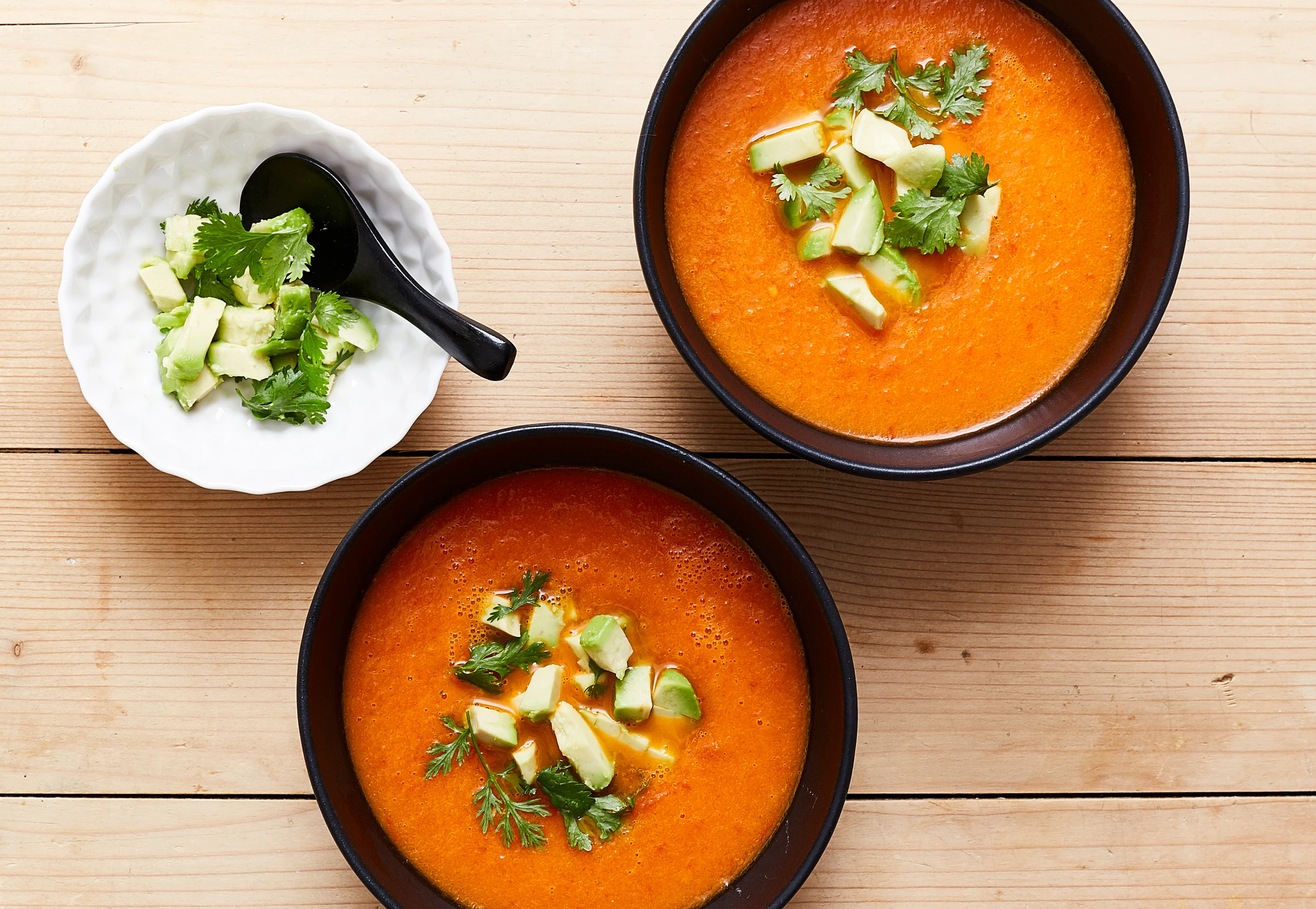 Paradeiser-Paprika-Suppe mit Avocado-Topping