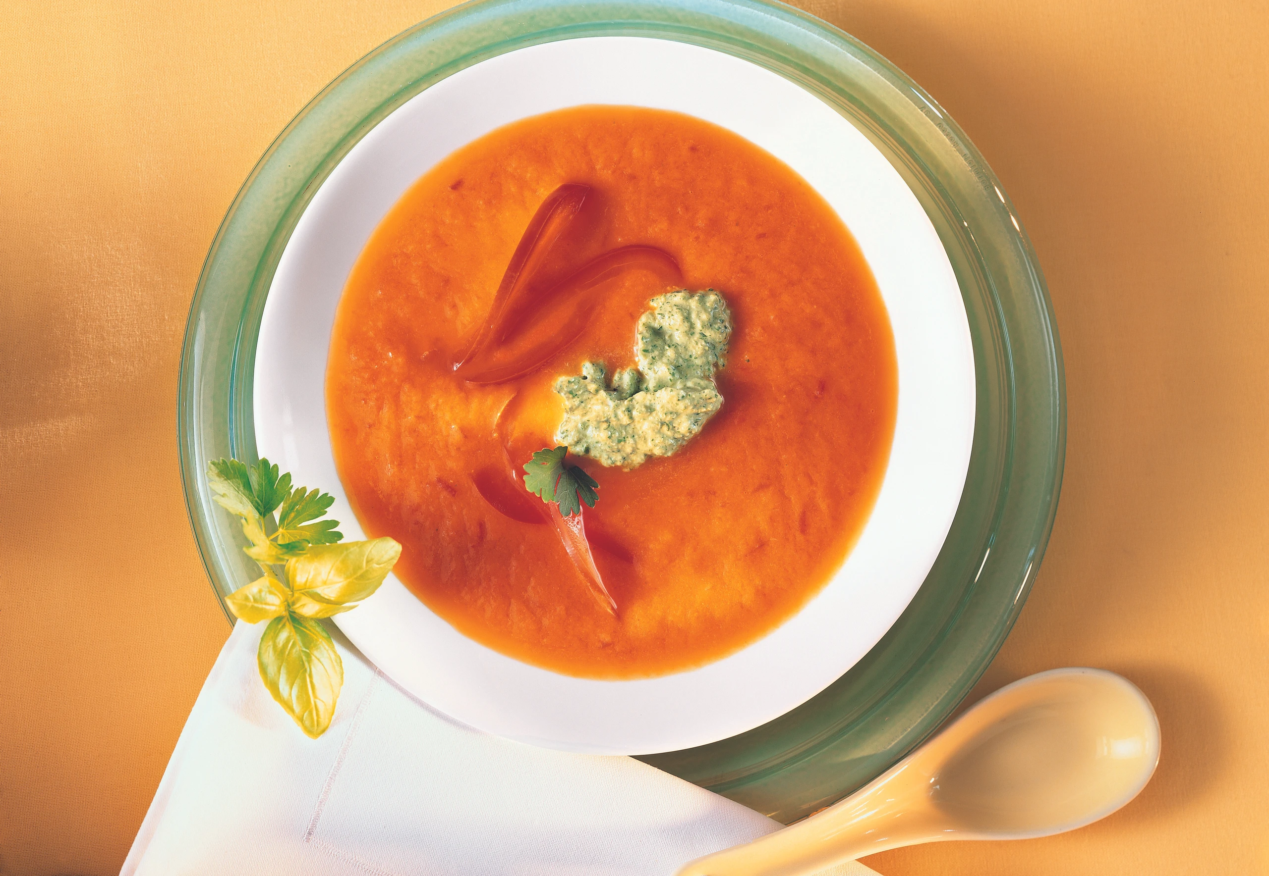 Paradeiser-Paprika-Suppe mit Basilikumcreme