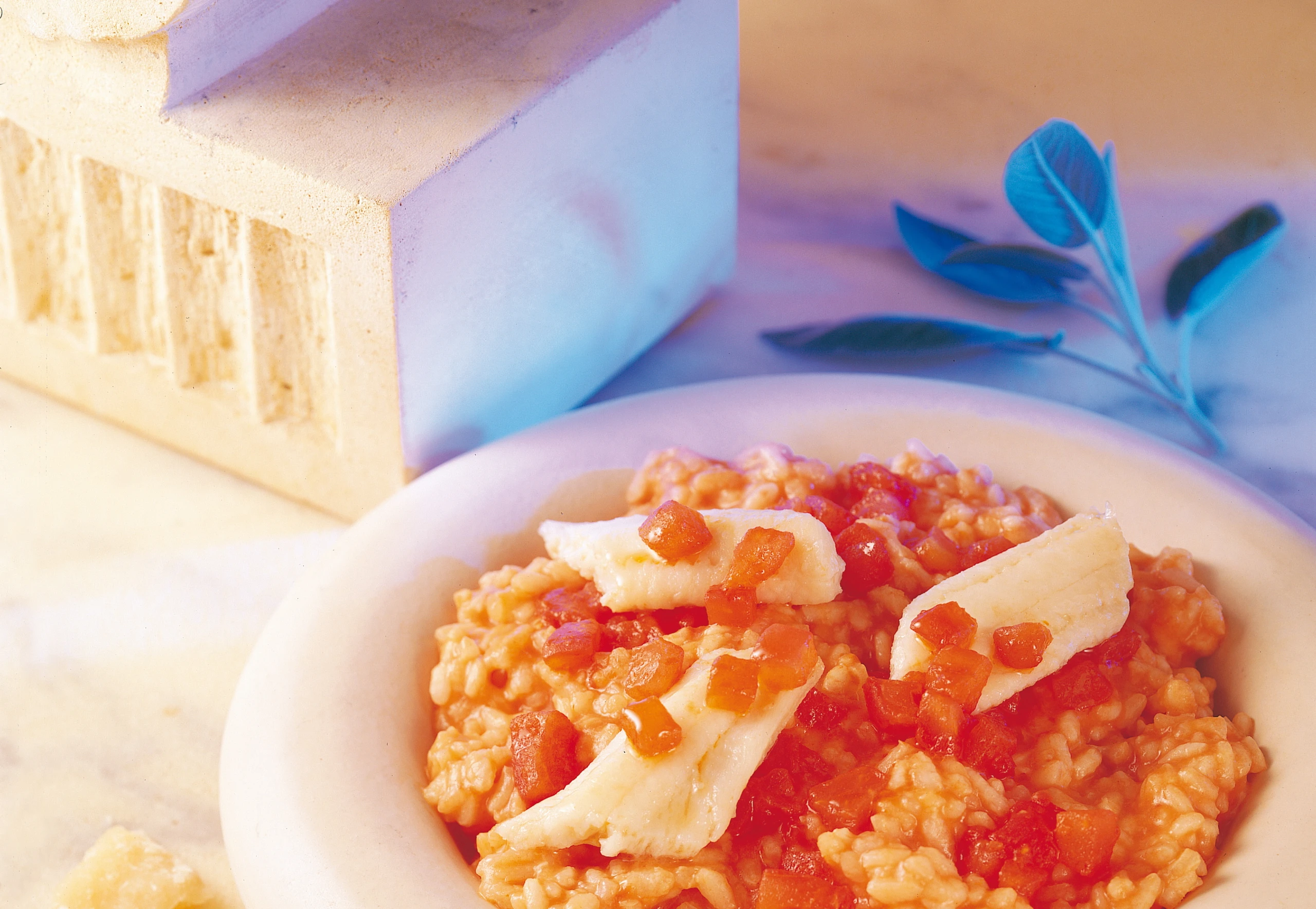 Zwiebel schälen, fein hacken und in 4 EL Olivenöl anschwitzen. Den Reis zugeben und mitrösten, bis er glasig ist. Reis mit ca. 1/4 l vom Paradeissaft aufgießen und auf kleiner Flamme unter ständigem Rühren köcheln.