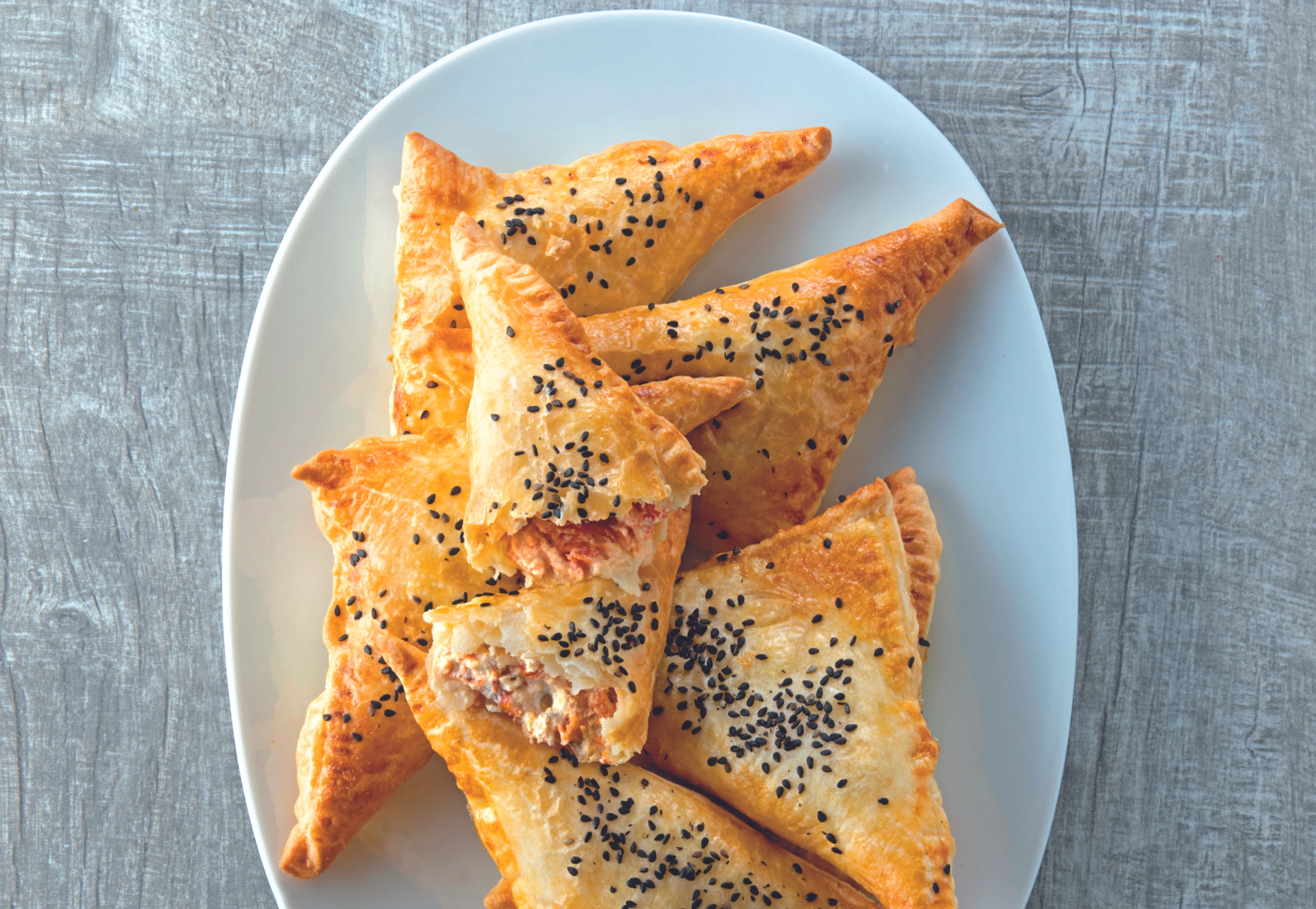Rohr auf 210°C vorheizen. Backblech mit Backpapier belegen. Teig aufrollen und das Papier abziehen. Teig in 6 Quadrate schneiden und die Fülle mit einem Löffel jeweils in die Mitte der Teigstücke setzen. Teigränder dünn mit Ei bestreichen. Teigstücke diagonal über die Fülle zusammenklappen und an den Rändern zusammendrücken.