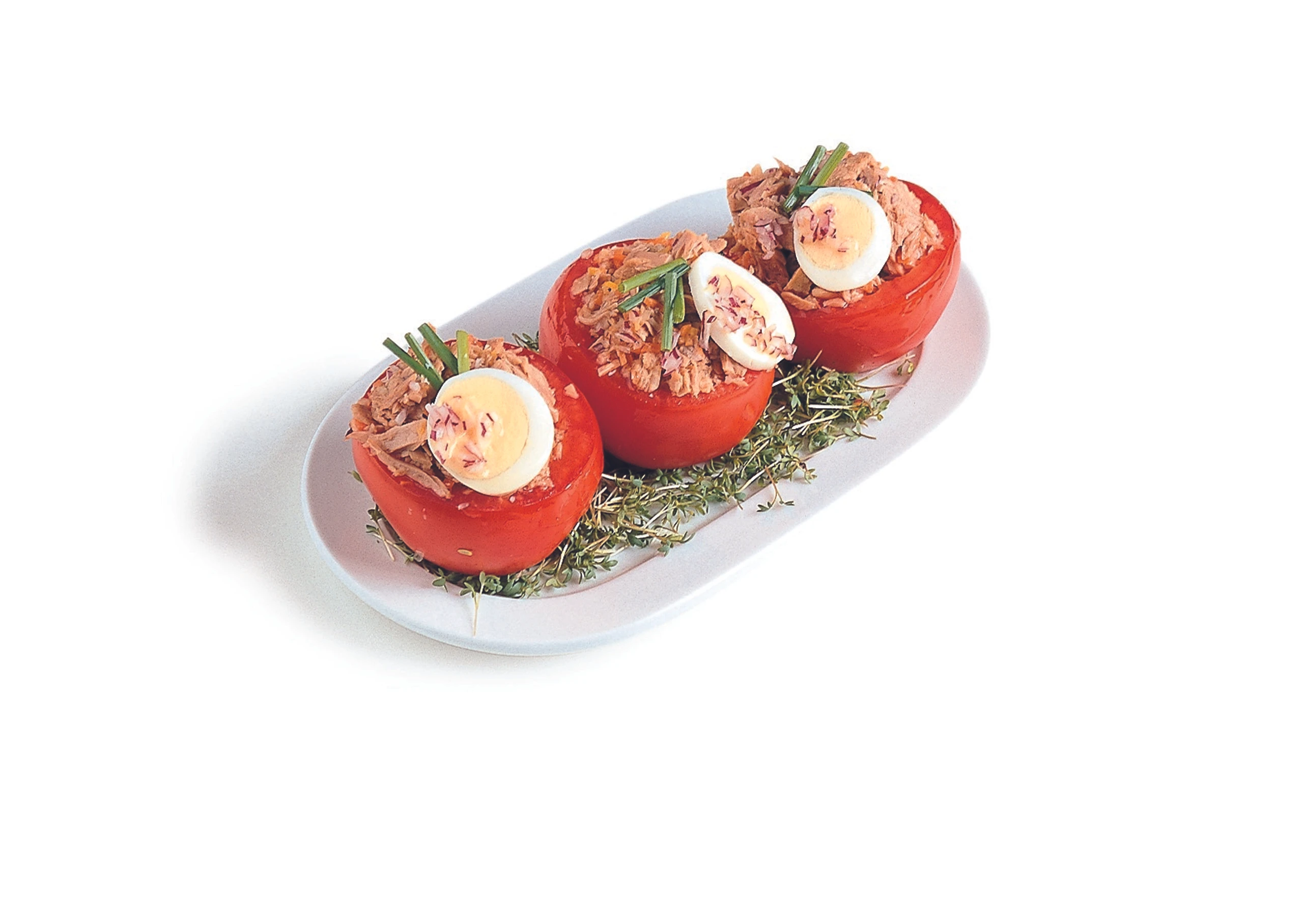 Thunfisch abtropfen lassen, in grobe Stücke teilen, mit Wurzelgemüse, Zwiebel, Öl und Balsamico marinieren, mit Salz, Pfeffer und Cayennepfeffer abschmecken. Paradeiser damit füllen, garnieren und auf Kresse anrichten. Garnitur: Wachteleier, Schnittlauch, rote Zwiebel