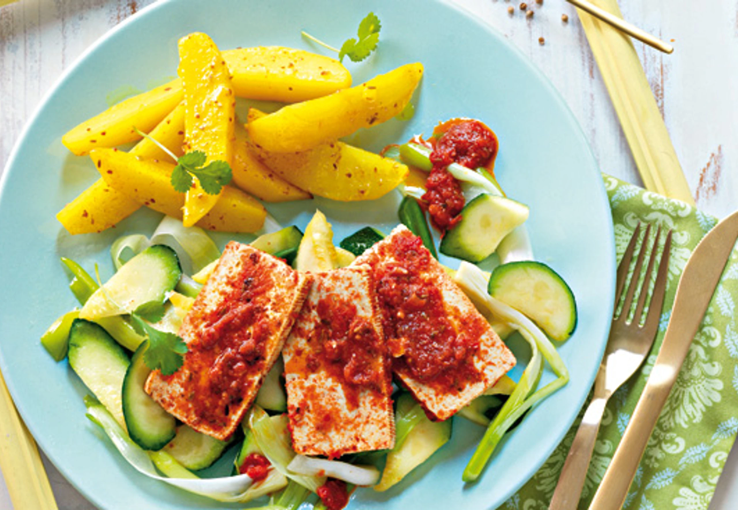 In einer beschichteten Pfanne 1 EL Öl erhitzen. Tofu darin auf beiden Seiten braten. Gemüse mit dem Paradeiser-Tofu und den Curry-Erdäpfeln anrichten.