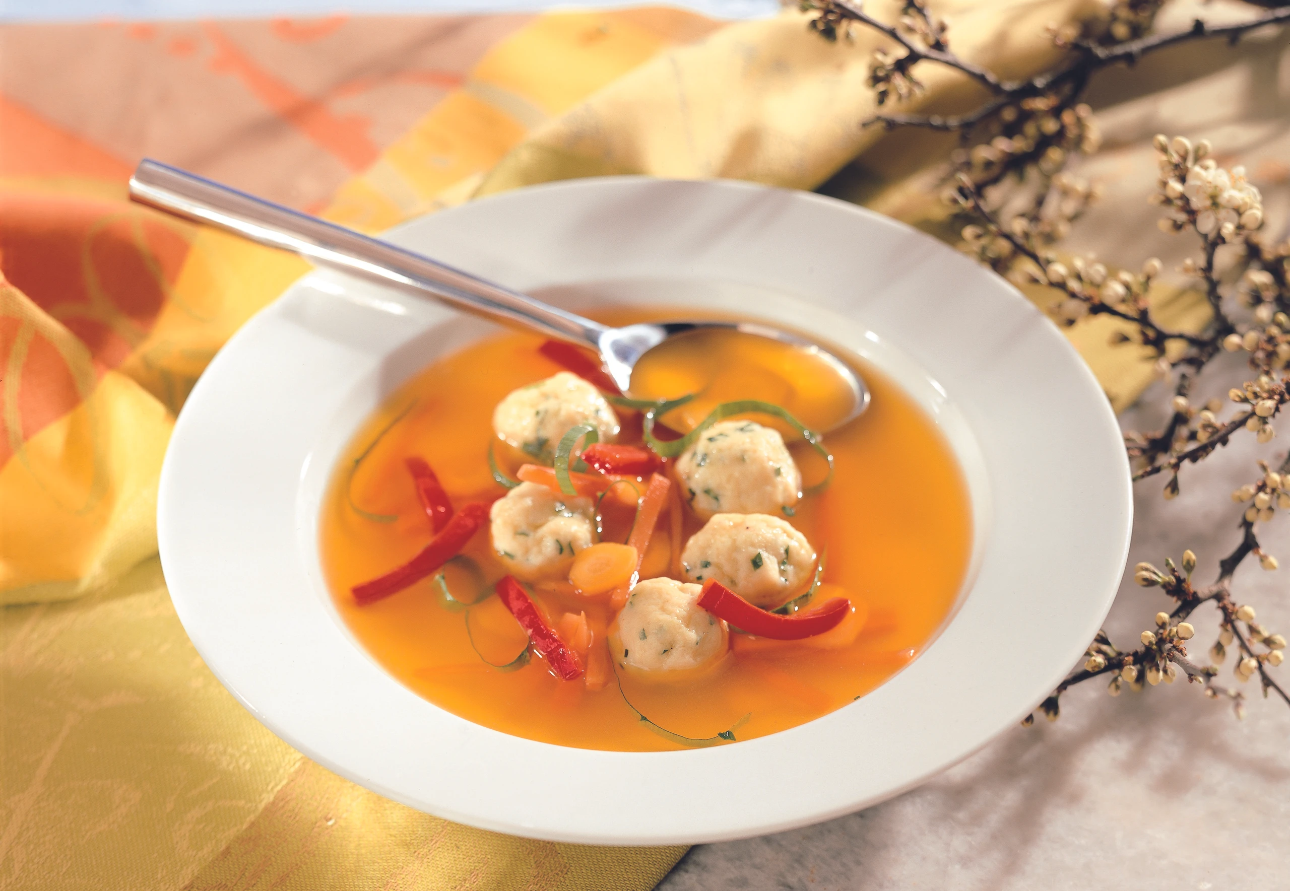 Parallel dazu die übrige klare Suppe (200 ml) aufkochen, Gemüse für die Einlage zugeben und bissfest kochen (ca. 4 Minuten). Gemüse samt Suppe mit der abgeseihten Suppe vermischen und kurz erwärmen, aber nicht mehr kochen. Suppe in vorgewärmte Teller schöpfen und mit den Bärlauchnockerln (siehe Rezept) als Einlage servieren.
