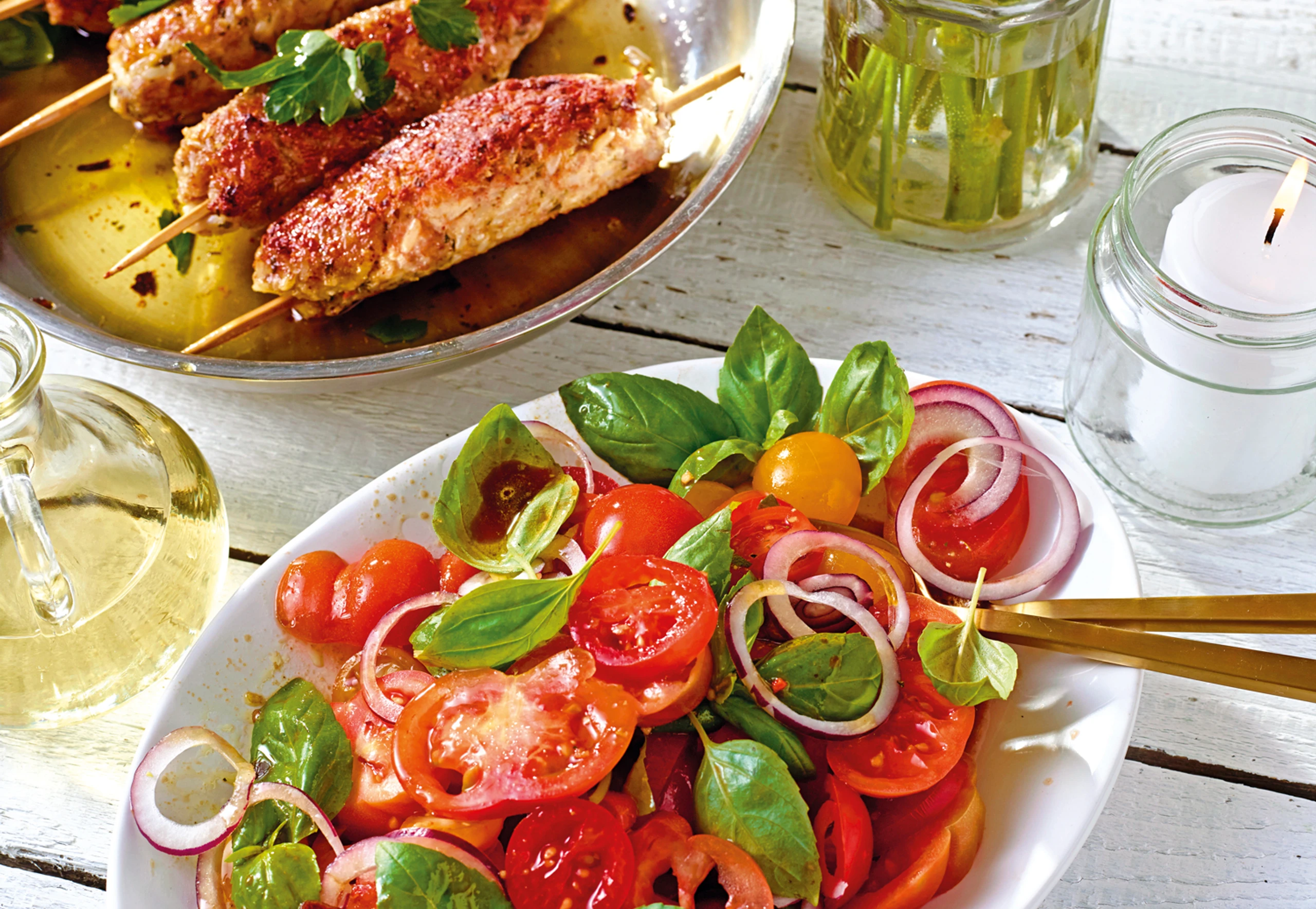 Spieße im Öl rundum braten, aus der Pfanne nehmen und auf Küchenpapier abtropfen lassen. Salat anrichten und mit den Spießen servieren.