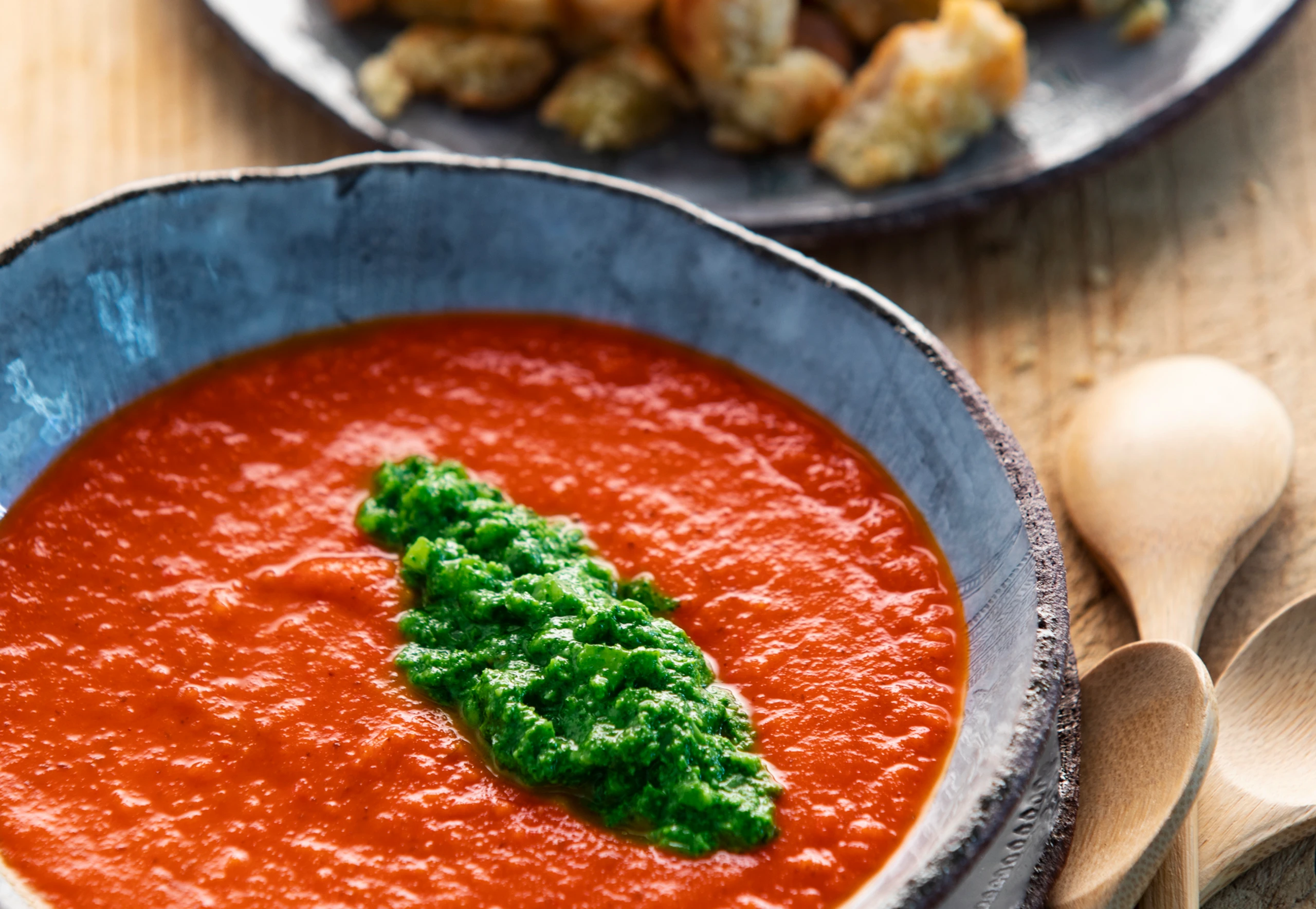 Paradeiser aus dem Rohr nehmen und Lorbeerblätter entfernen. Paradeiser samt Suppe in einen Topf füllen und ca. 20 Minuten köcheln. Mit dem Stabmixer fein pürieren, falls nötig, mit wenig Wasser verdünnen. Suppe mit Kräutersalsa und Croûtons anrichten.