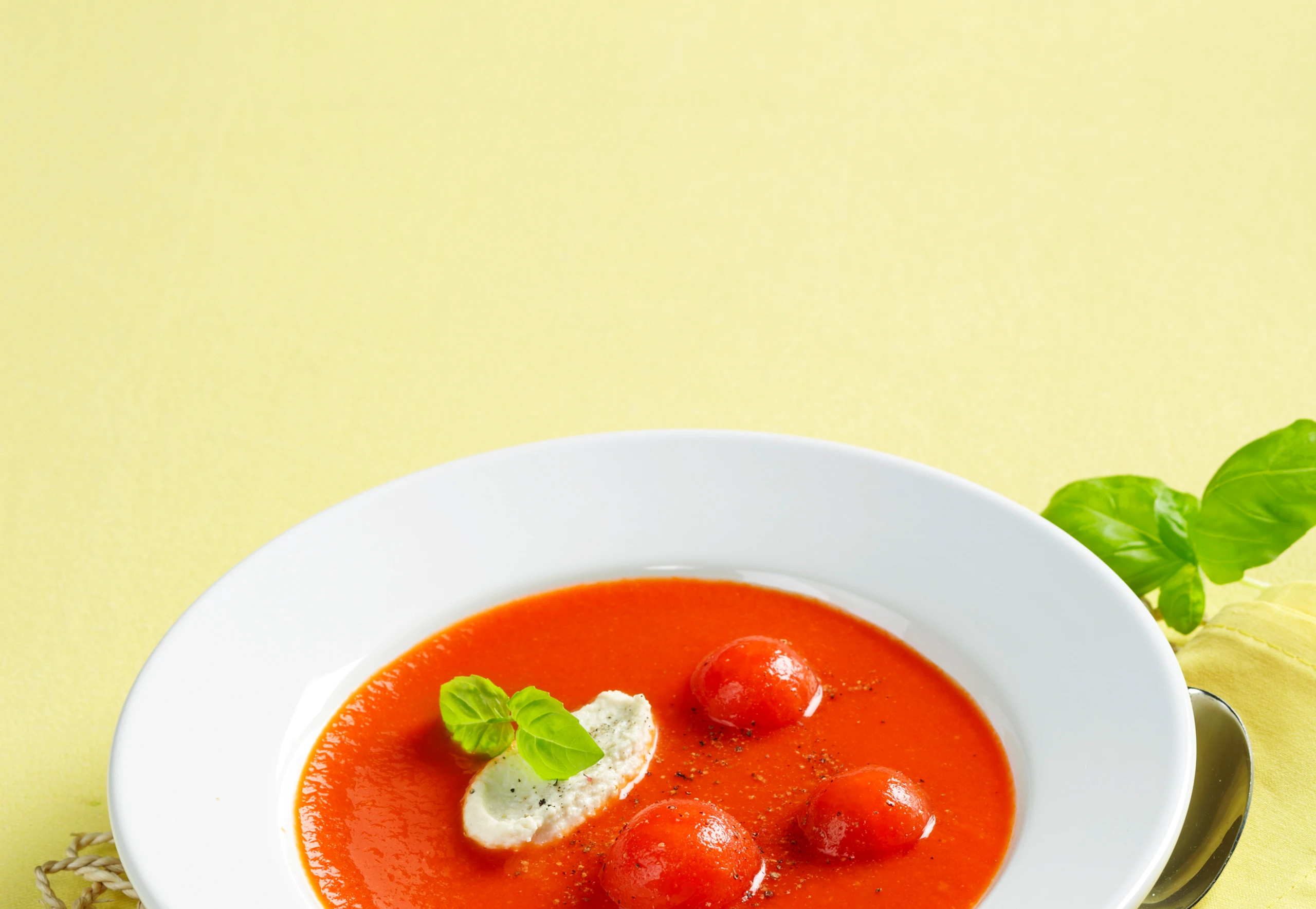 Lorbeerblatt herausnehmen, Suppe mit dem Mixstab fein pürieren, mit Salz und Pfeffer abschmecken. Suppe mit Cocktailparadeisern anrichten. Aus der Mandelcreme Nockerln ausstechen und in die Suppe legen. Mit Basilikum garniert servieren.