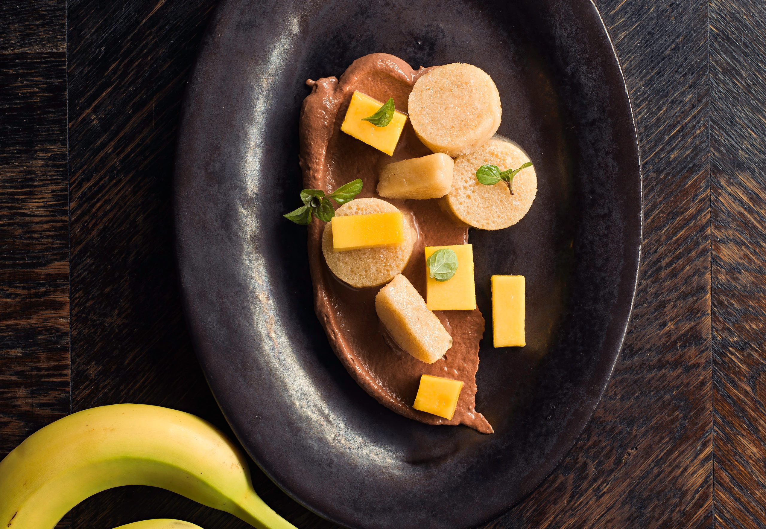 Für die Canache Kuvertüre über Dampf schmelzen. Banane schälen und klein schneiden. Obers, Bananenstücke, Dotter und Zucker gut verrühren und bis knapp unter den Siedepunkt erhitzen; ständig rühren. Mischung in die geschmolzene Kuvertüre rühren, Masse mit dem Stabmixer fein pürieren.