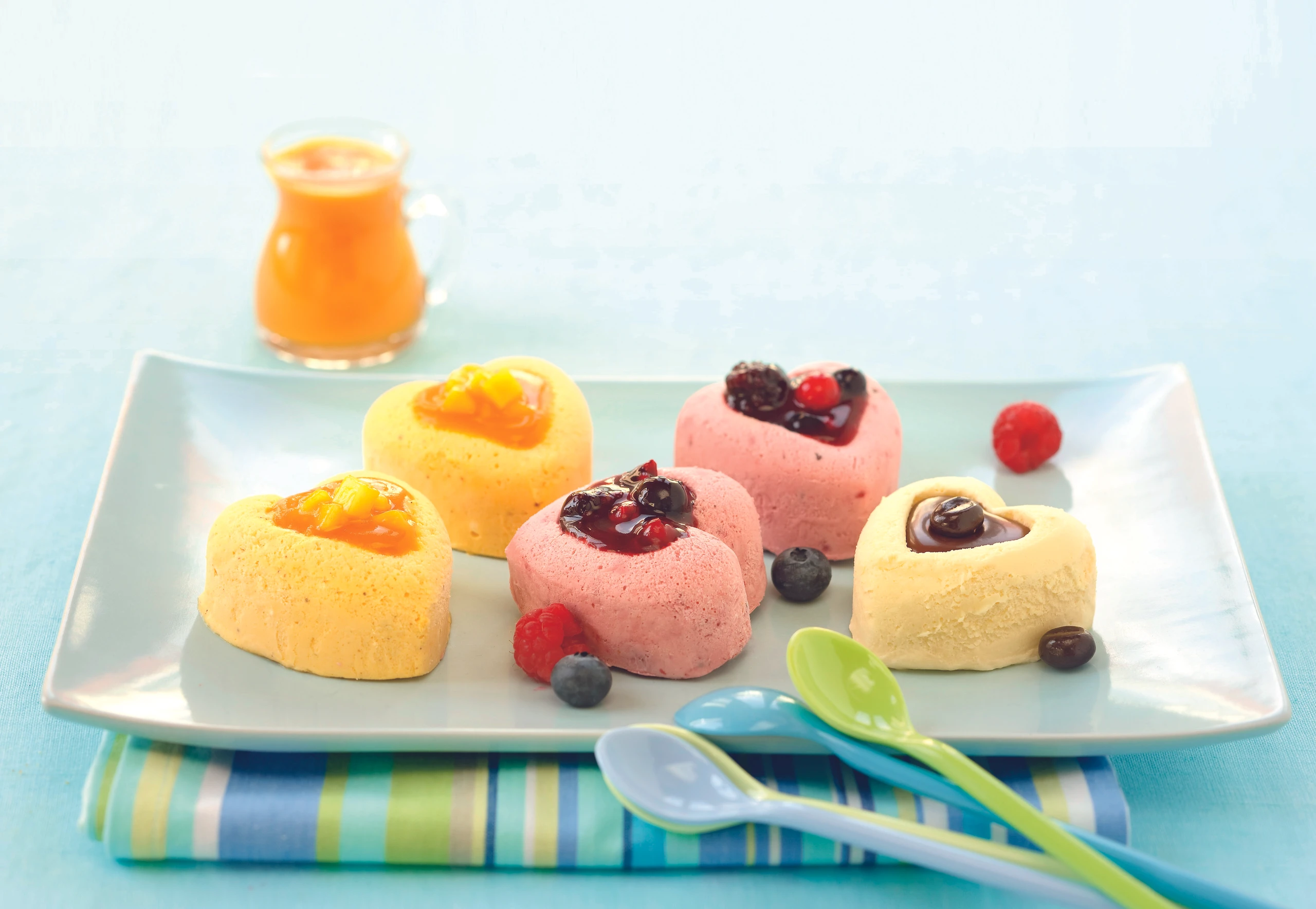 - Form kurz in heißes Wasser stellen, Herzen herausstürzen, Vertiefungen mit Beerensauce füllen.