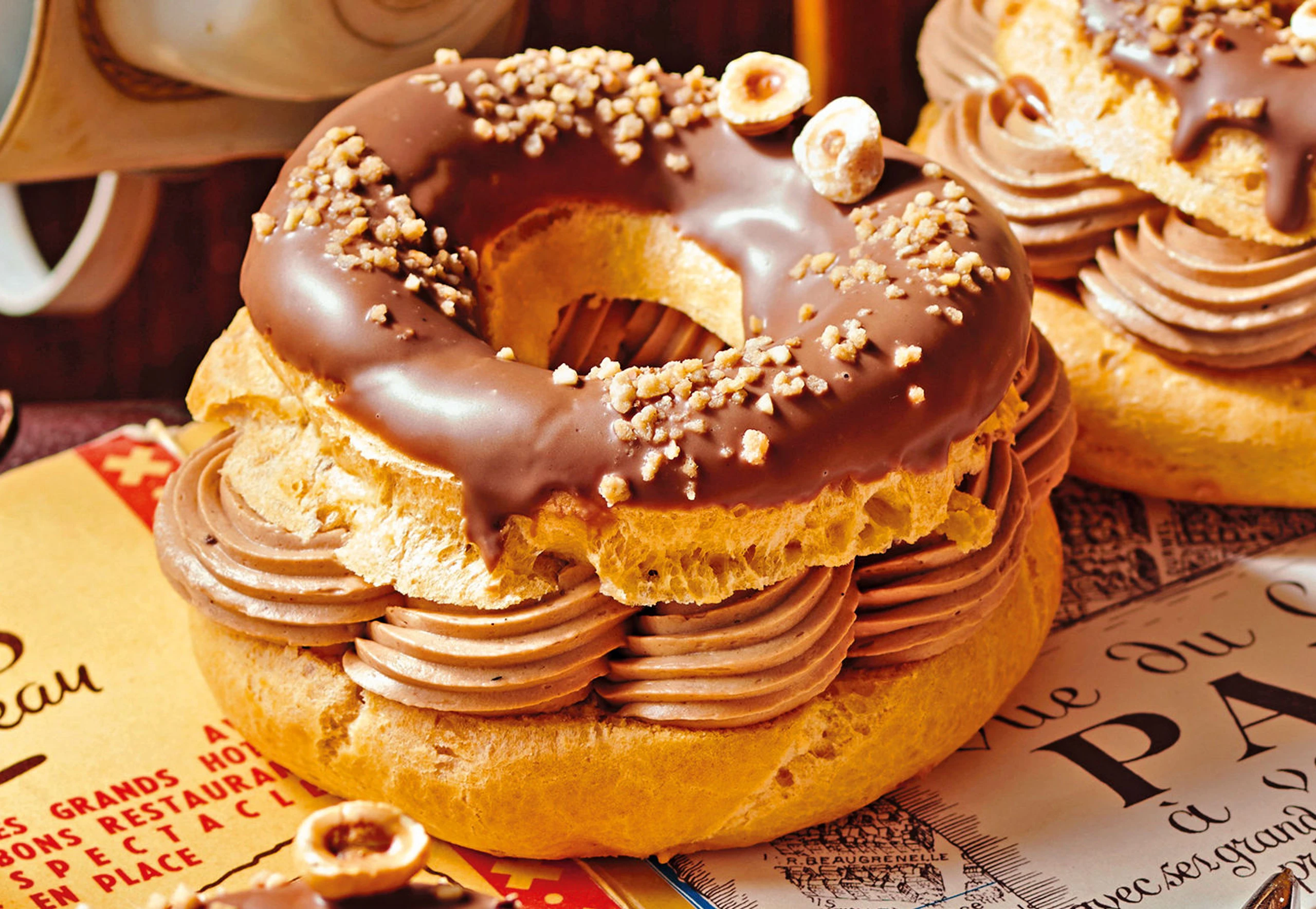 Für die Creme Nougat und Milchkuvertüre über einem Wasserbad schmelzen. Butter und Staubzucker ca. 5 Minuten cremig mixen, Nougatmischung und Vanillecreme untermixen. Creme in einen Dressiersack mit gezackter Tülle füllen und auf die Brandteigringe dressieren. Deckel darauf legen.